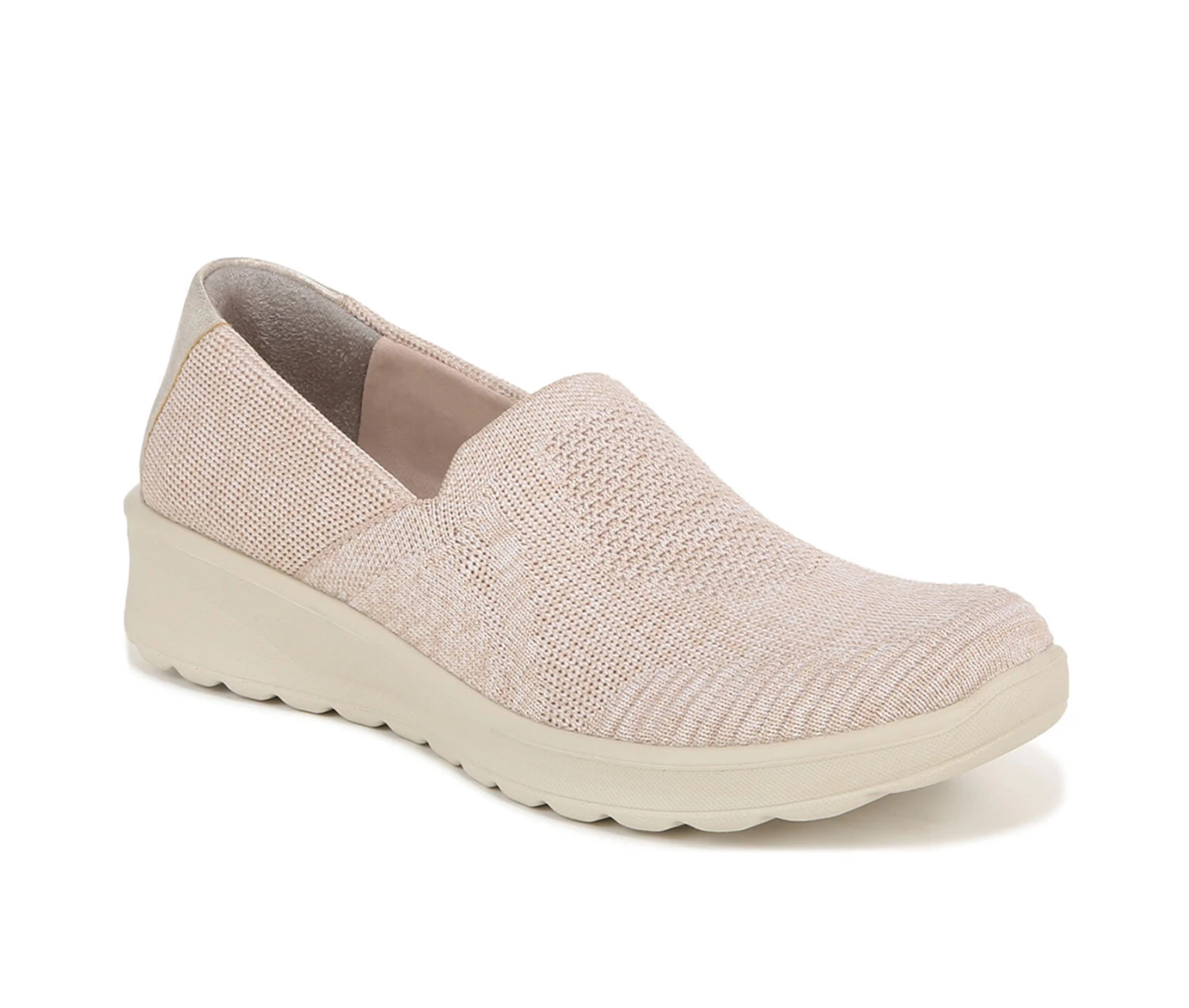 - Womens slip on shoes like no other! Machine washable, lightweight and so loveable, this style has it all. Stretch engineered knit upper with partially recycled linings and round toe. Slip on fit. BLOOMâ„¢ materials: Sustainable algae-infused foam layer under the insole. BZEES Cloud Technology: Designed so you’ll feel weightless, energized and free. Air Infused Outsoles: Bzees are ultra-lightweight, soft, & bouncy. Dynamic Stretch Uppers: Stretch fabrics move & groove with you. Free Foam Footbeds: Crazy-cushy anatomical insoles are blow-your-mind comfy. Get Width It: Every pair of Bzees comes in wide width shoes for women. SoCush Memory Foam arch support. Anti-Microbial and Odor Control technology. 1 1/4 inch heel. Machine Washable: Wash on cold and air dry.