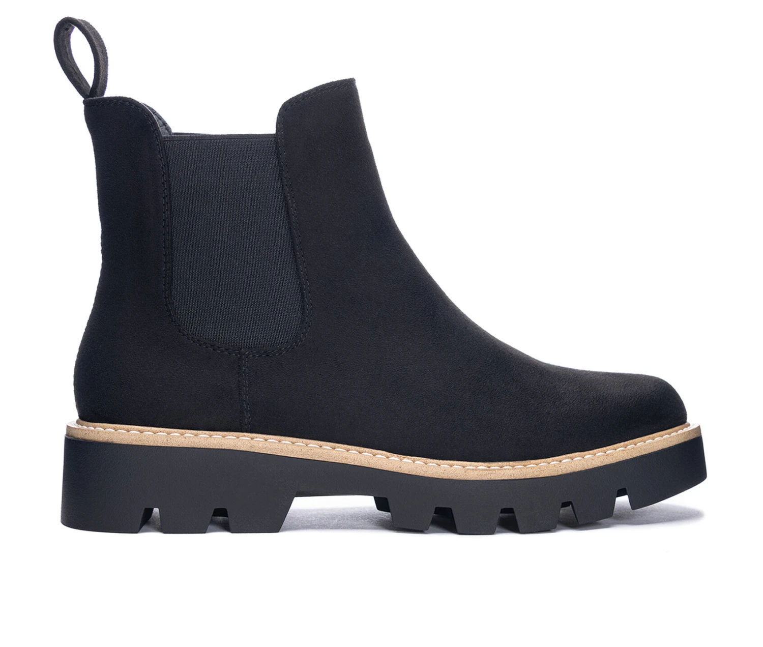 - Chic little chelsea bootie with contrast trimon the faux-suede upper, featuring a lightweight chunky lug sole and a pull-tab at the back for easy on/off