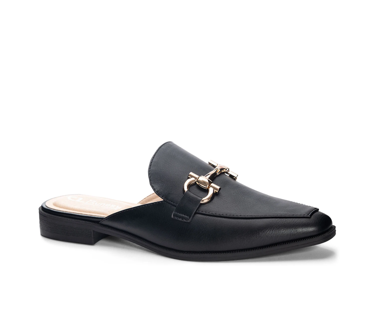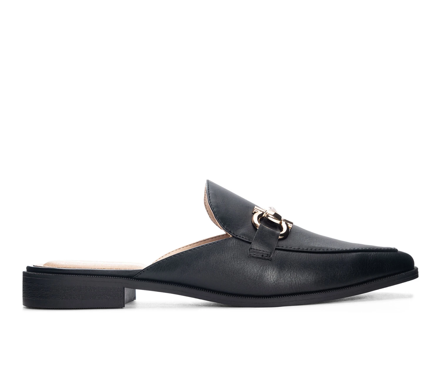 - Fashion and comfort meet with this snip toe open back mule featuring a gold ornament.
