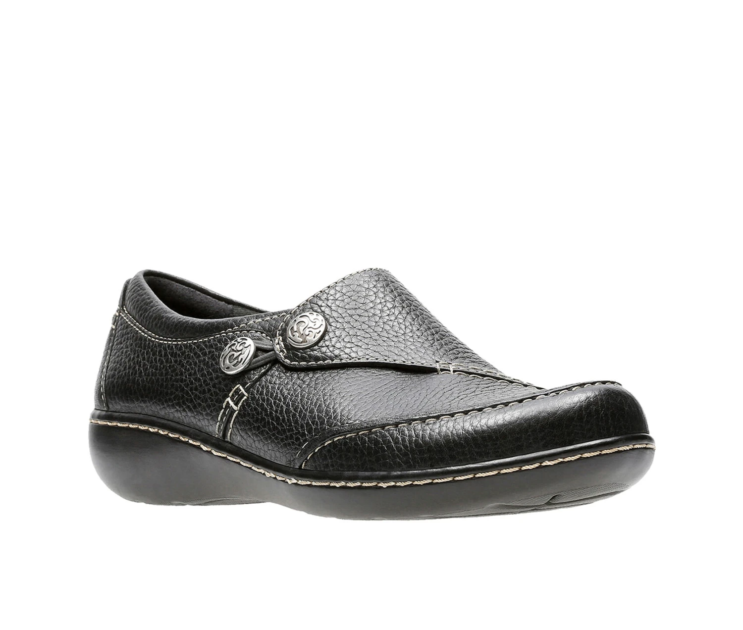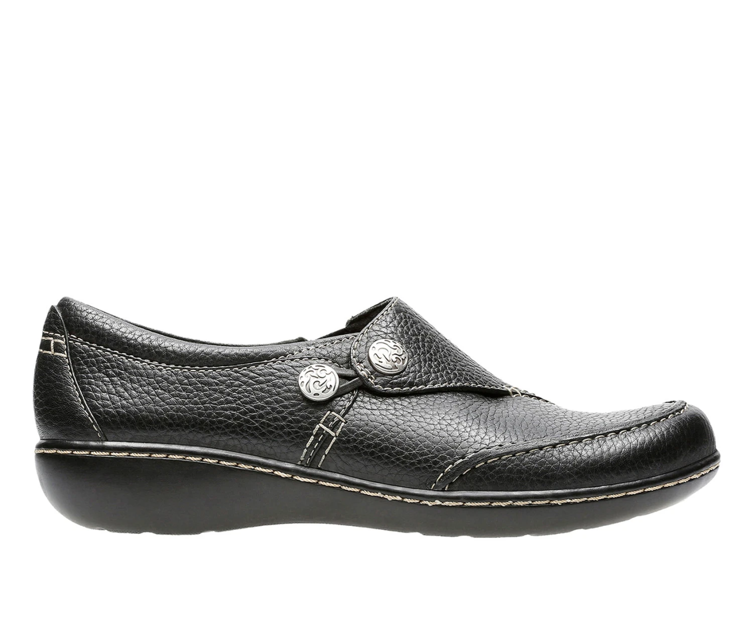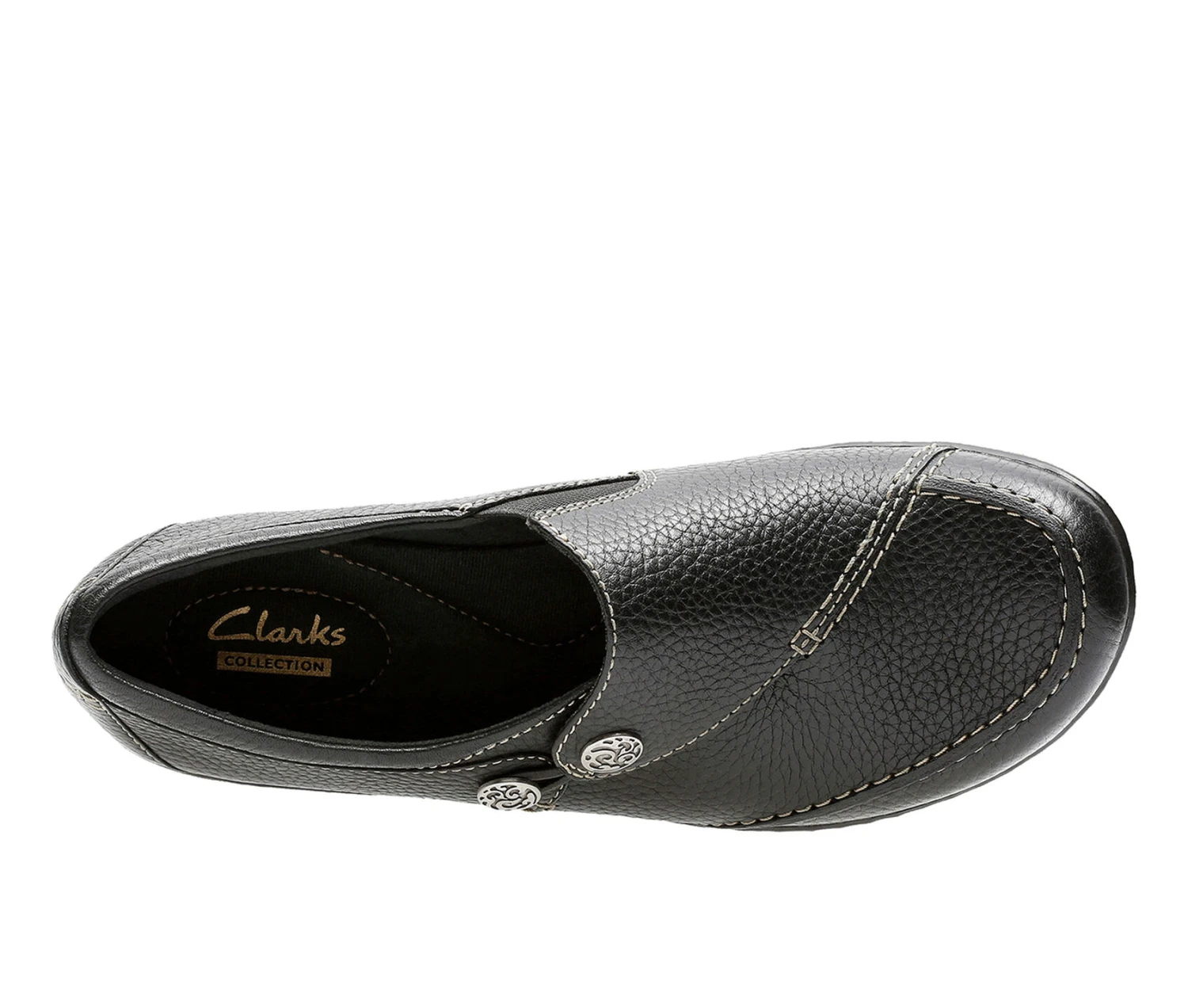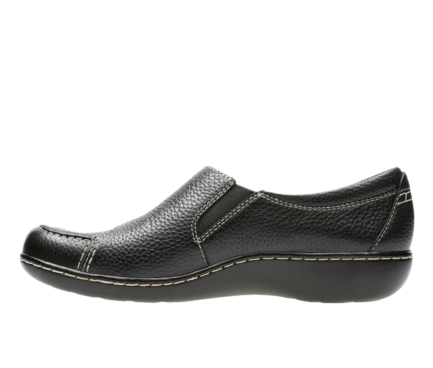 - The ultimate in ease and wearability, this classic slip-on shoe from the Clarks Collection is crafted of supple redwood leather on a popular low-wedge bottom. Incredibly comfortable, it features a stretch gore, fabring linings and super flexible, lightweight TPR outsoles. This go-to women’s shoe is an excellent choice for career or casual wear.