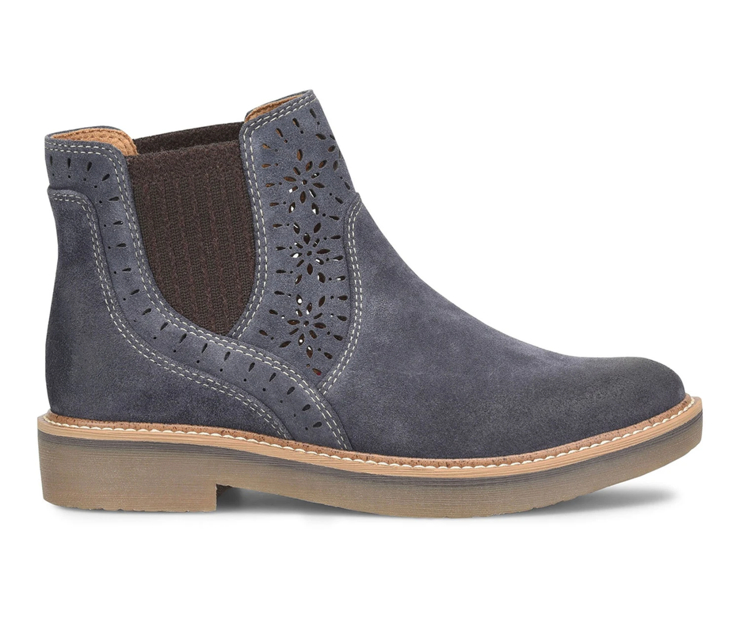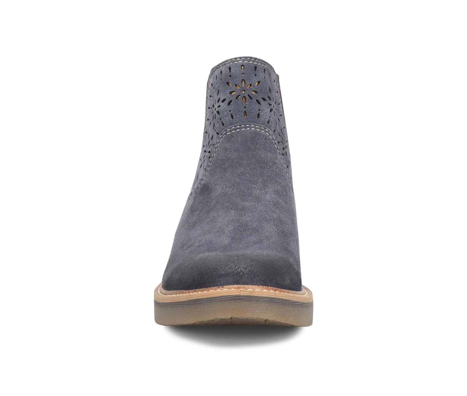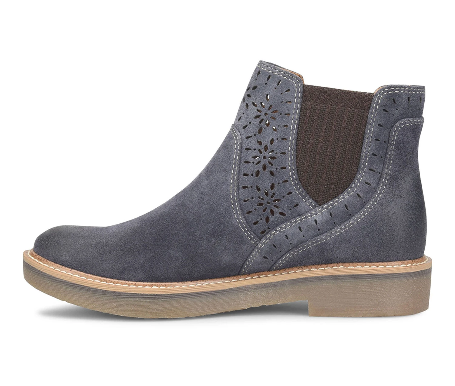 - A charming Italian suede bootie with pretty artisan floral lasercut details you’ll love. Thanks to cozy stretch knit panels on the side, the Raya is a breeze to slip on and off, too.