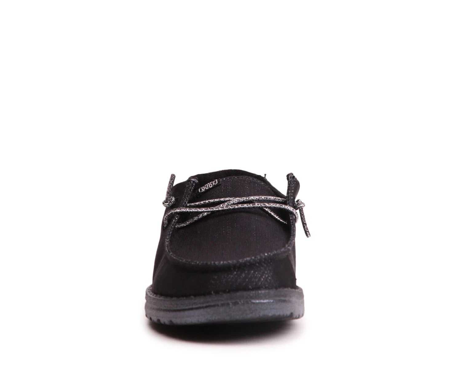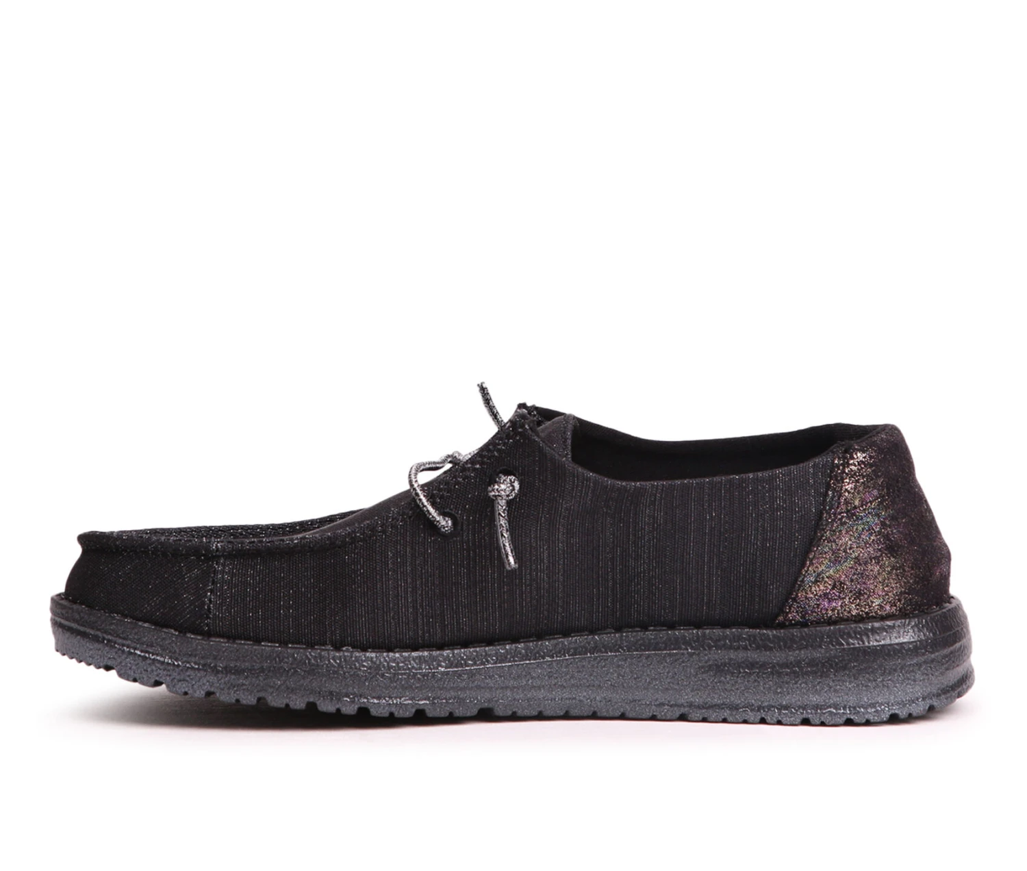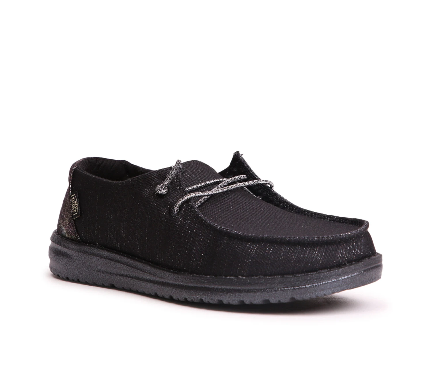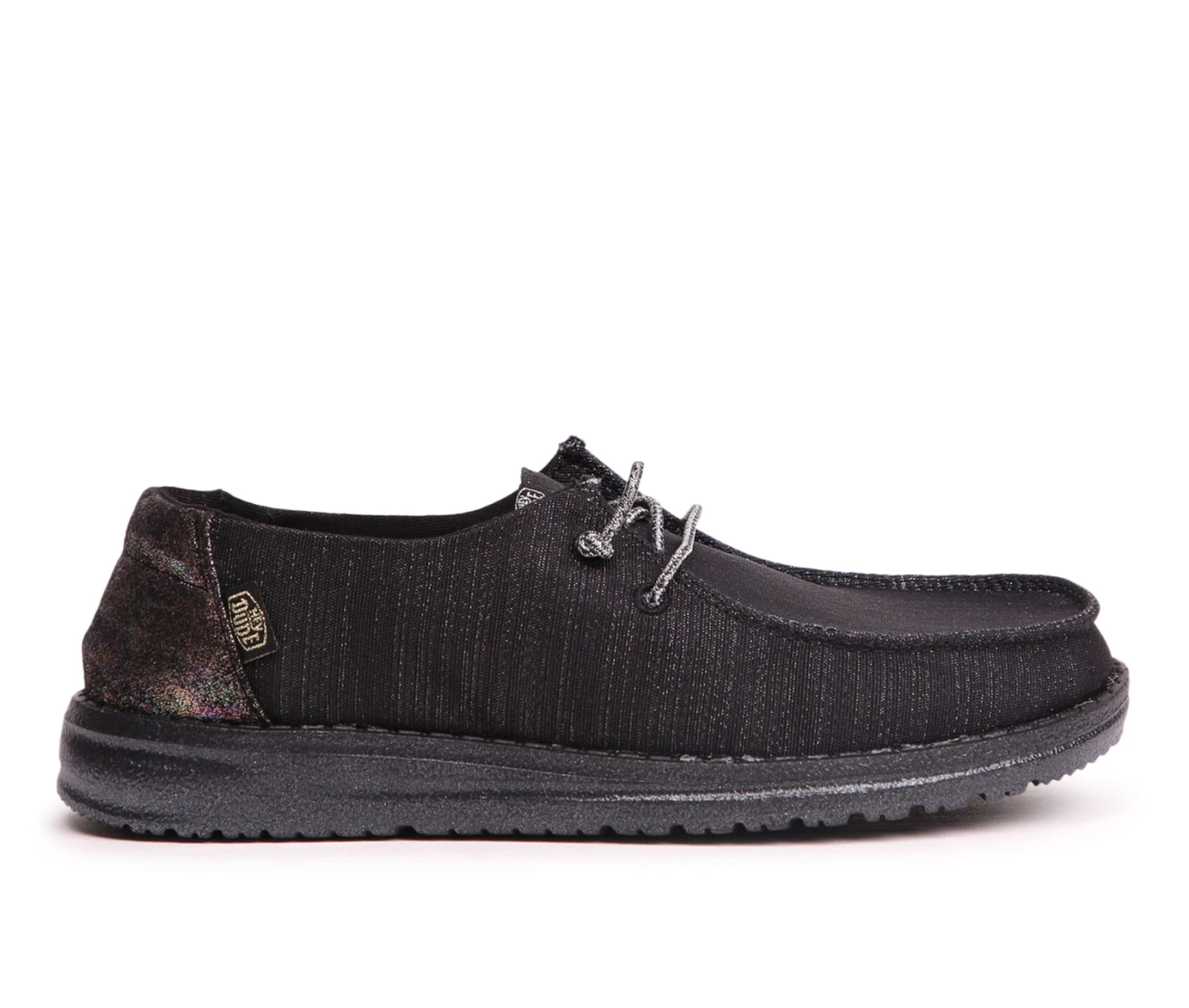 - Featuring a durable, metallic textile upper in front of a fun glittery heel, and shines with an extra layer of foot-hugging foam. Lined with a light cotton-blend lining for lustrous strides. Finished off on an ultralight outsole with our easy-on, elastic lacing system. You’ve got one red-carpet ready shoe.