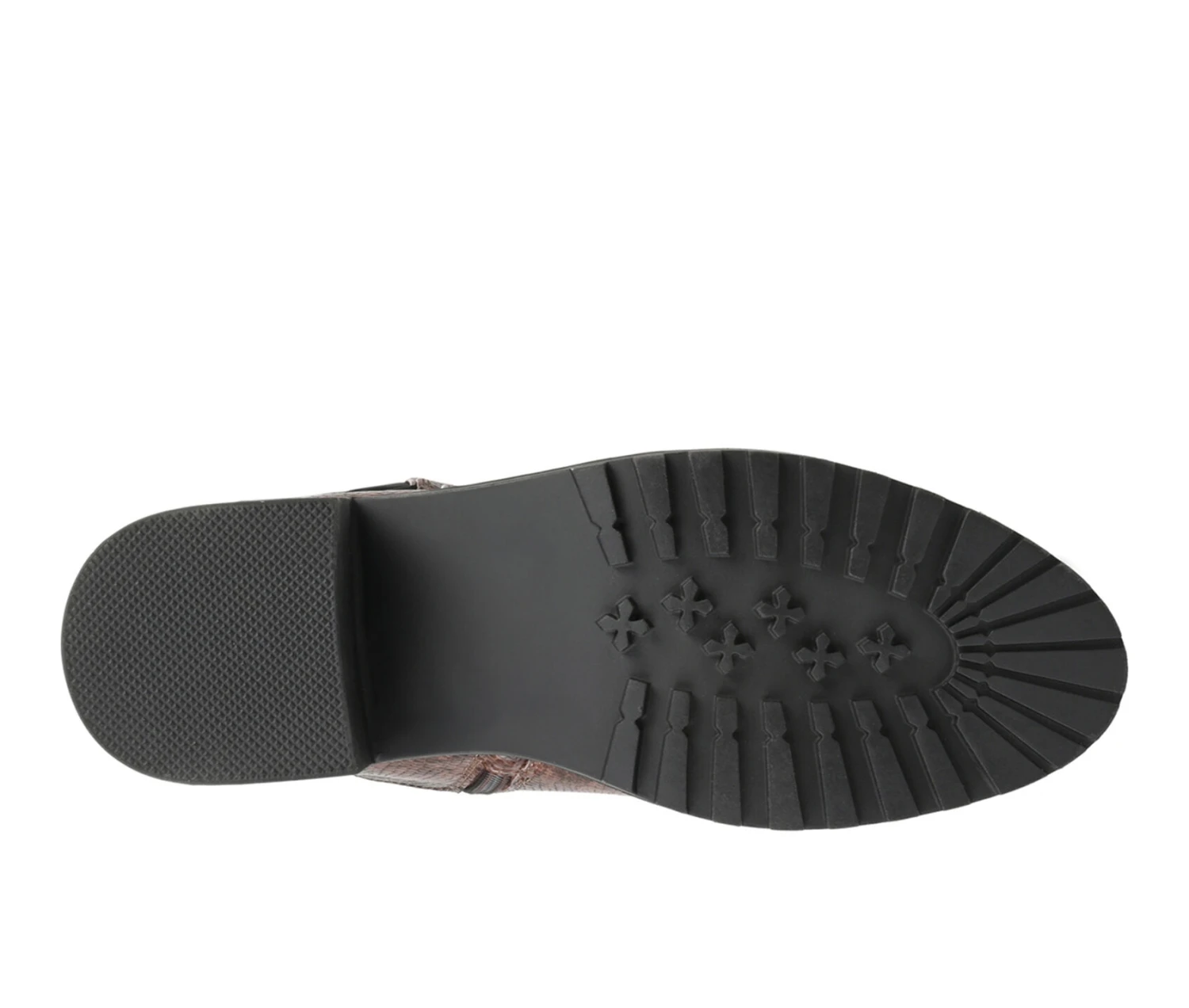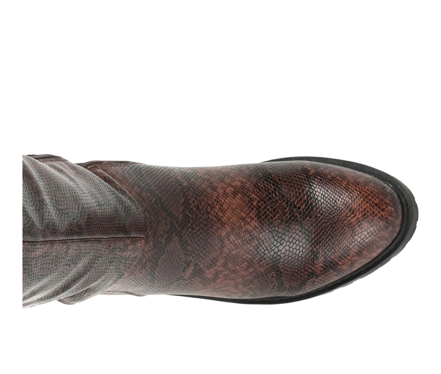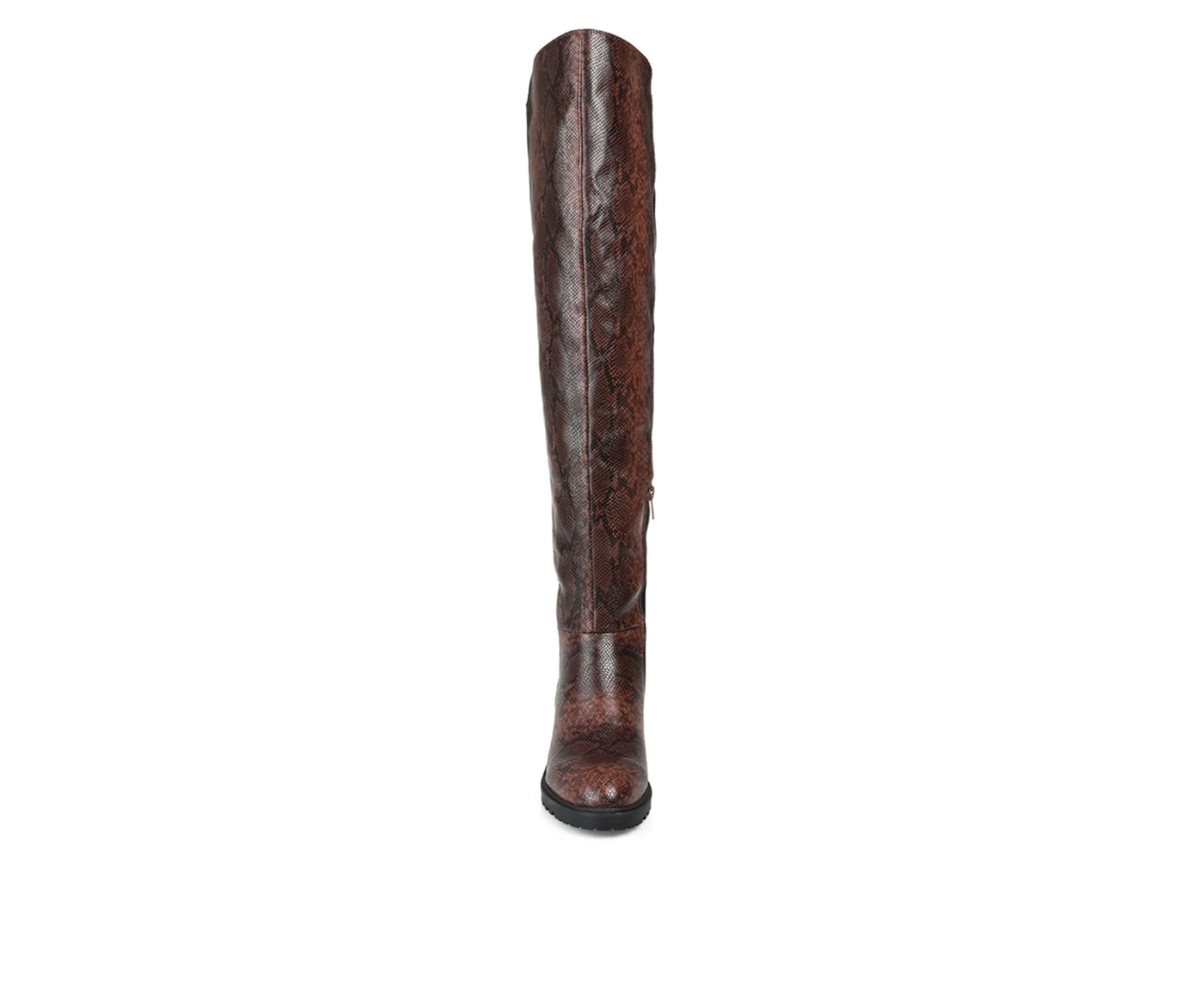 - The perfect piece for your next night out, the Aryia by Journee Collection. This extra-wide calf design features textured vegan leather uppers detailed with a stretch gore accent and an inside zipper. A 4 mm Tru Comfort Foamâ„¢ footbed and a classic almond-toe finish this over-the-knee style.