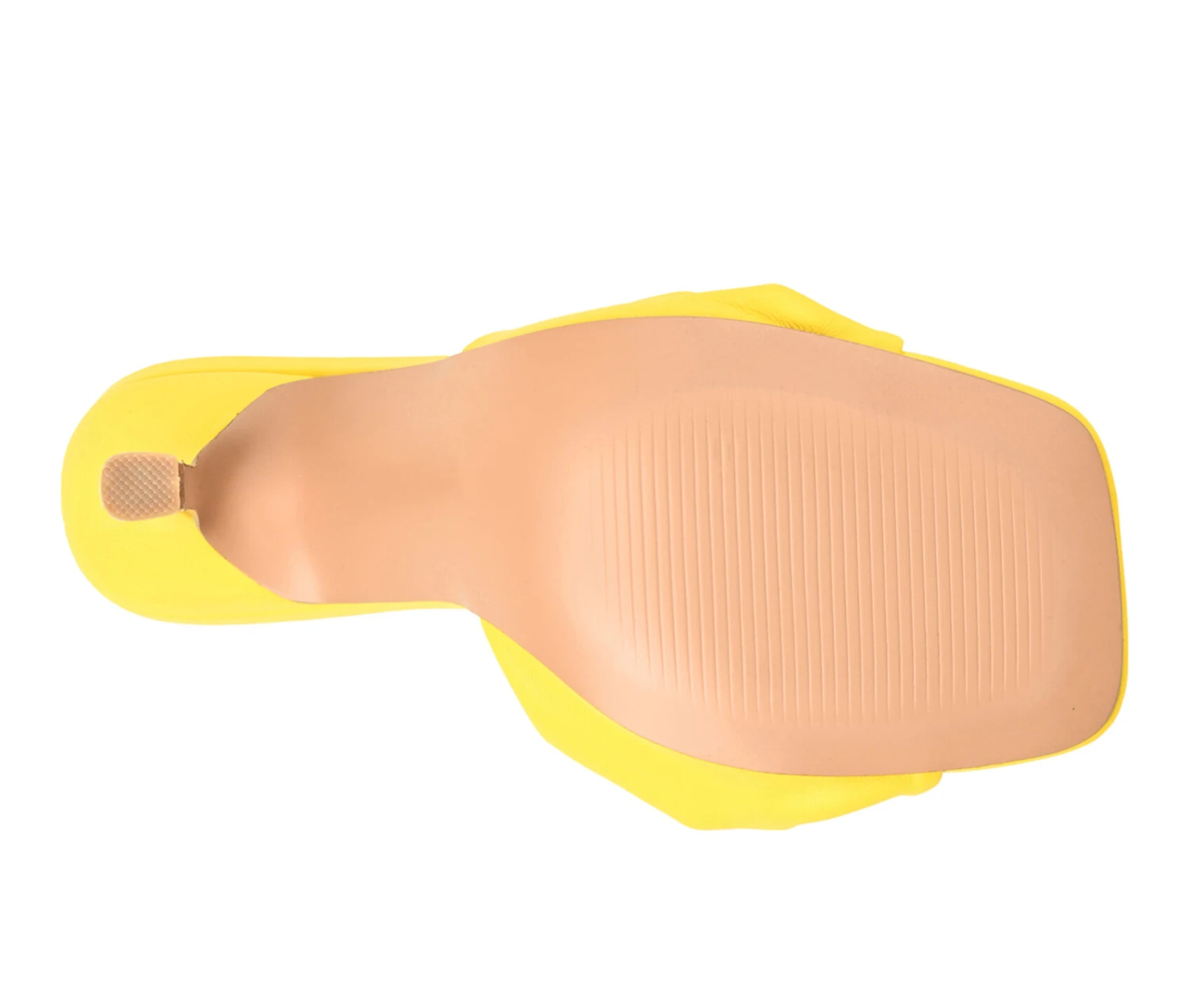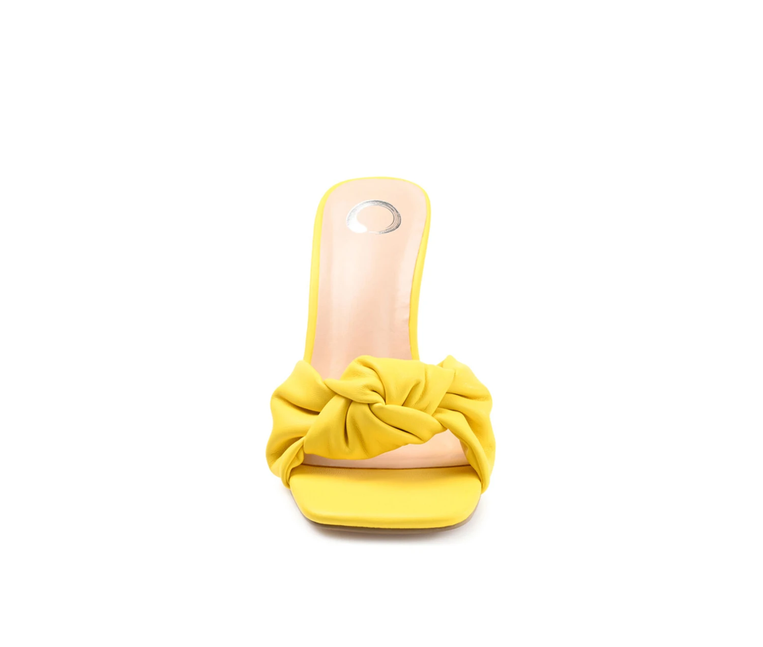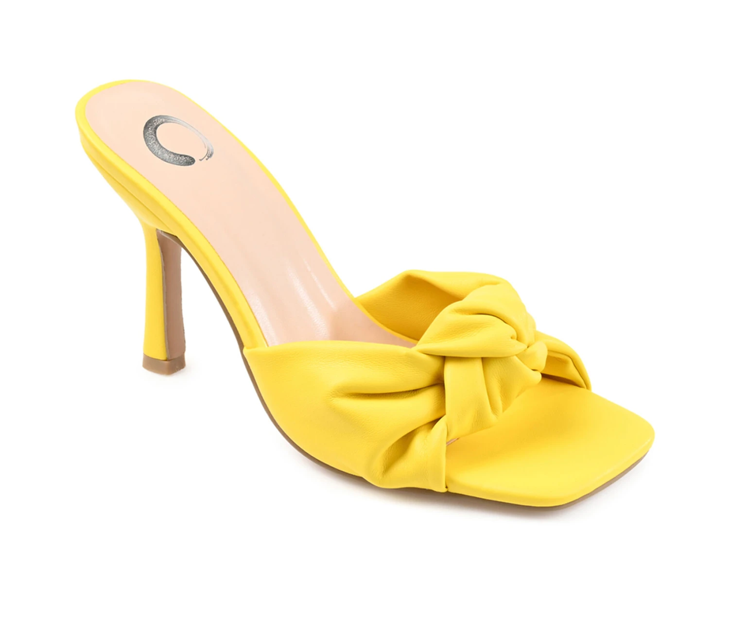 - Add some eye-catching flair to your look with Diorra by Journee Collection. This slide-on design features supple vegan leather and a padded footbed for ease and comfort. A pencil-thin heel and a knot detail at the strap complete the design for a chic look. Luxe Vegan Leather, Single Band, Knotted Detail, Open Square Toe, Slip On, Stiletto Heel