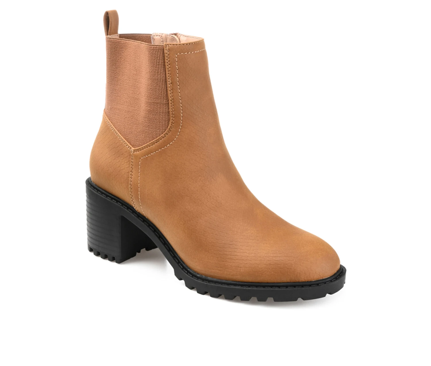 - No wardrobe is complete without the Hallie bootie by Journee Collection! This round-toe bootie is made with premium vegan leather supported by a chunky block heel and a treaded sole. An inside zipper, a stretch gore accent, and a 4 mm Tru Comfort Foam™ insole complete this effortlessly chic design.
