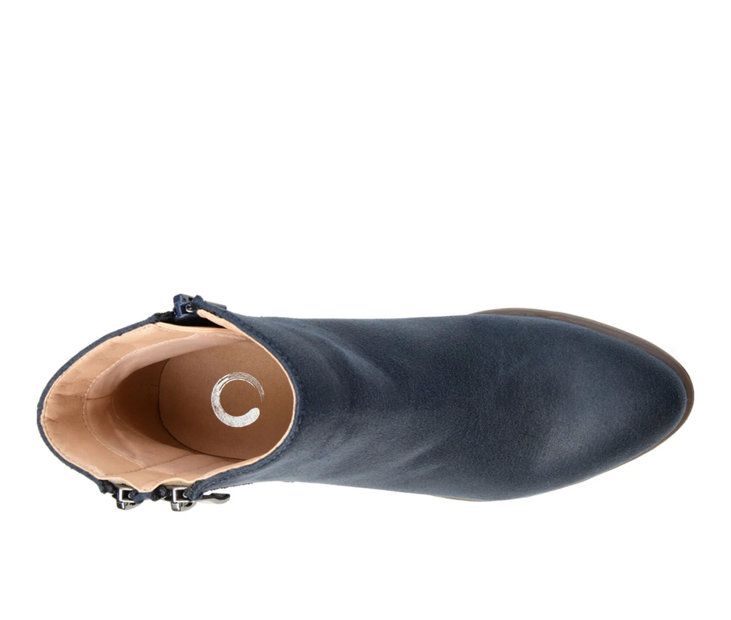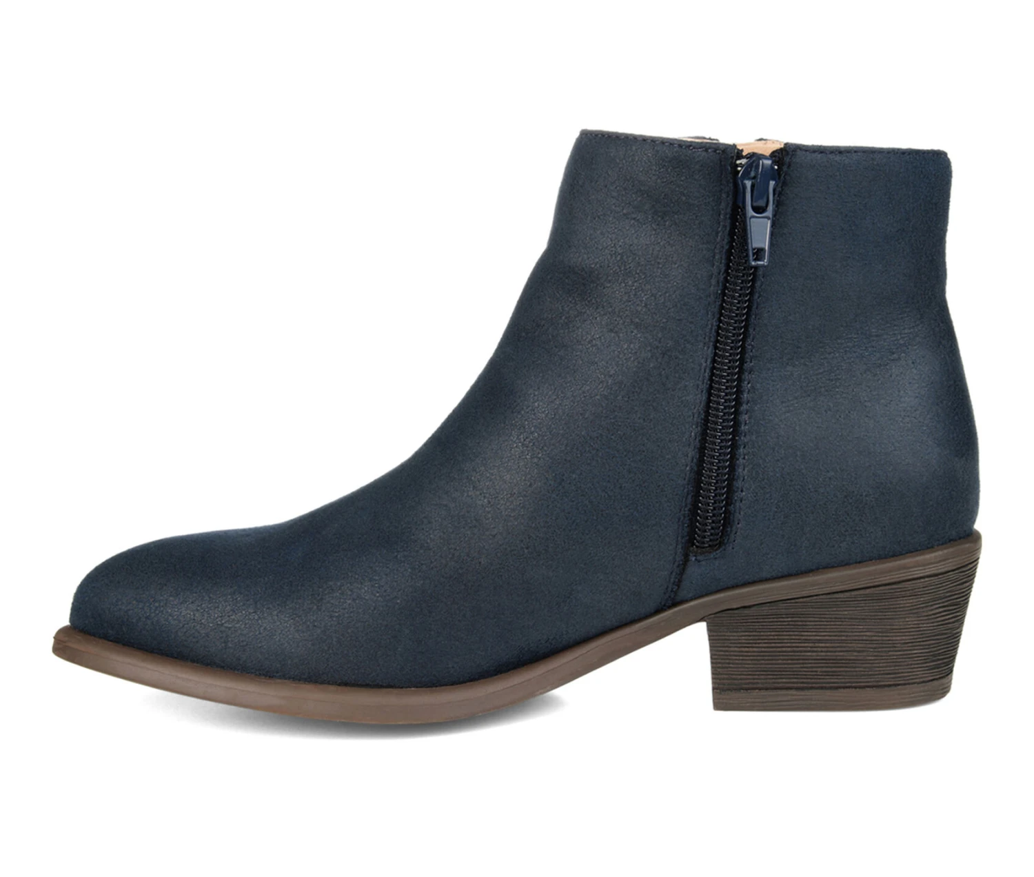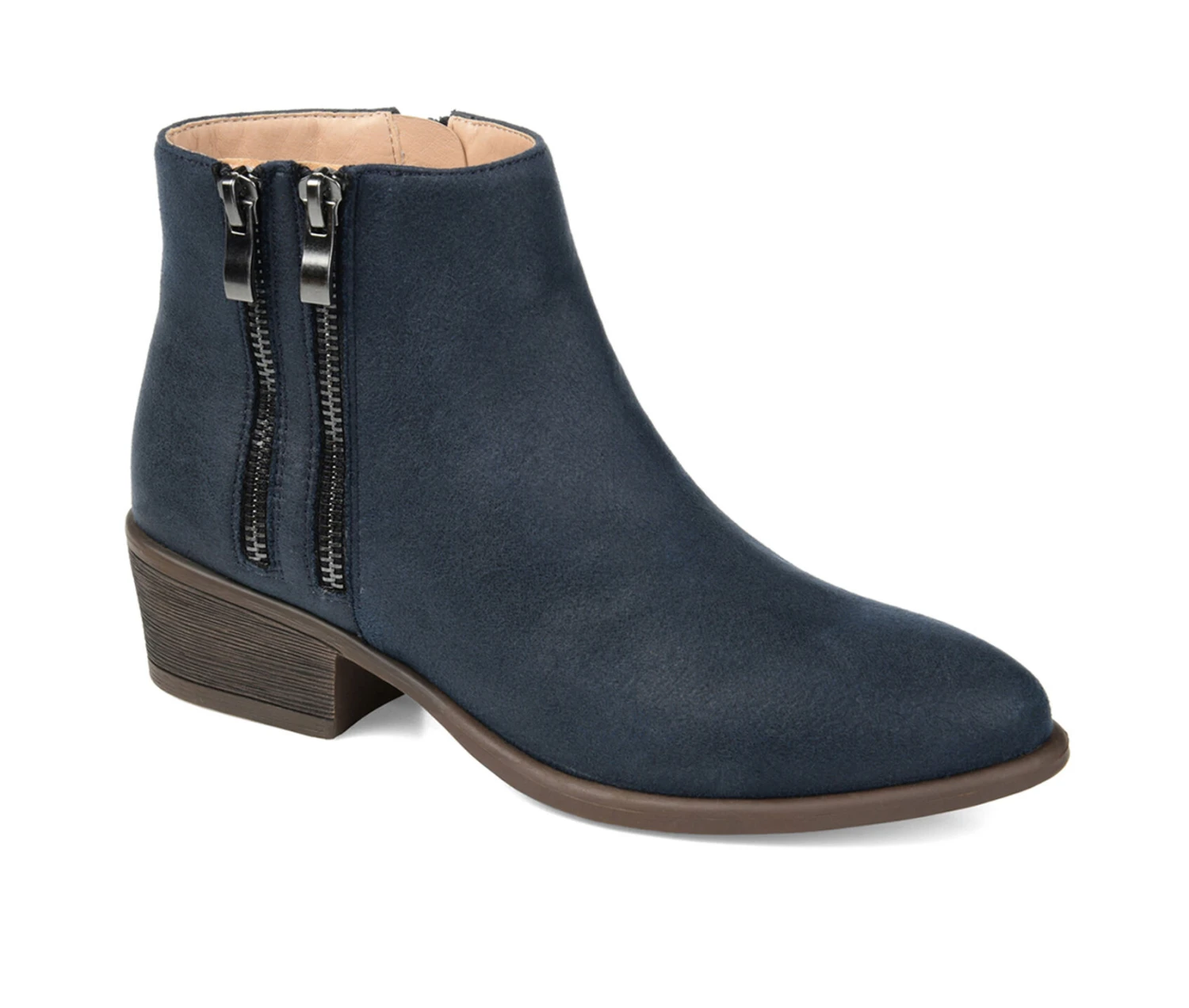 - The season isn�t over without the Jayda bootie by Journee Collection. This faux suede distressed bootie showcases a dual vertical zipper accent on the outside of the bootie. The almond toe and perfect heel height complete this design.
