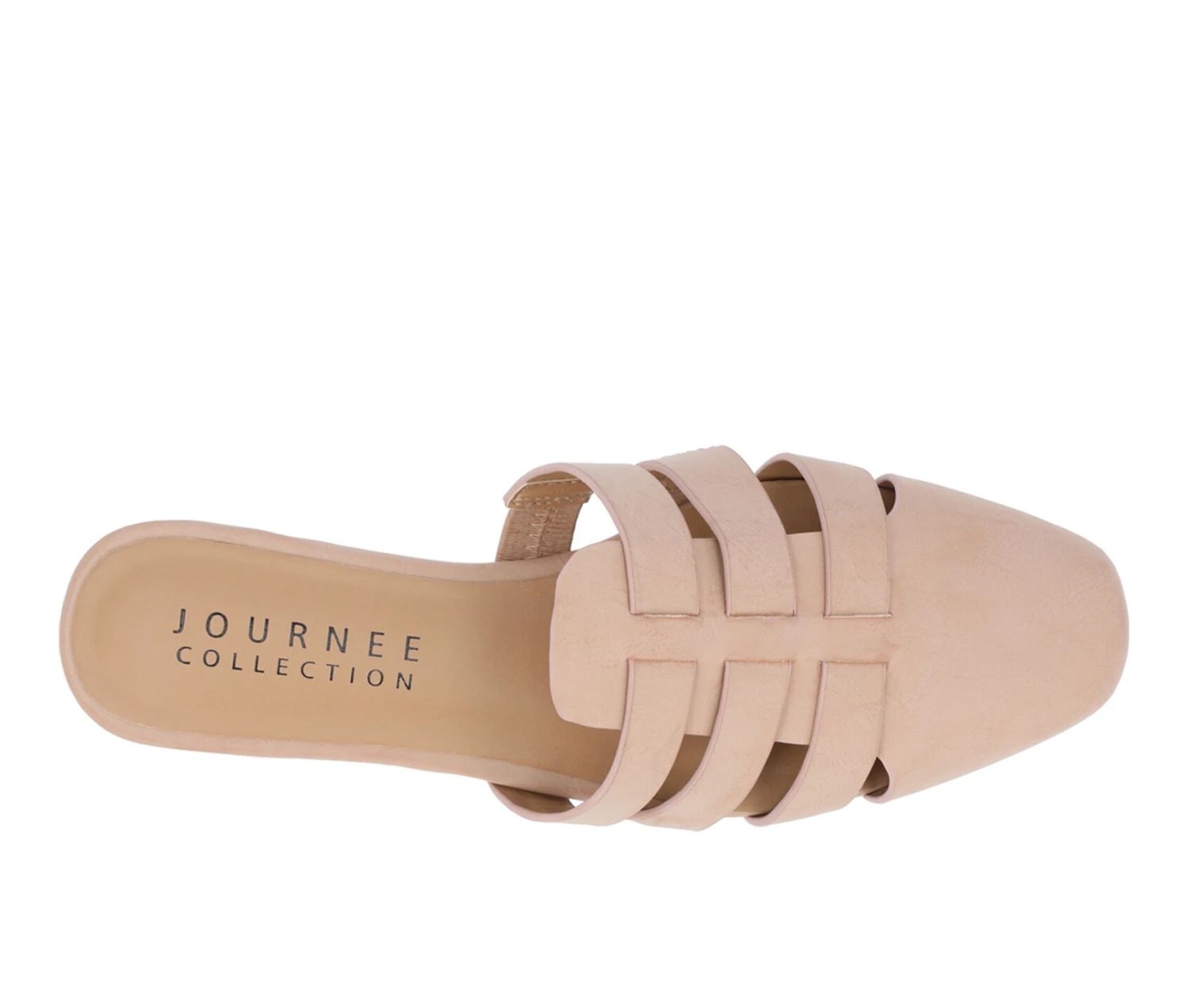 - The Jazybell block heel flat from Journee Collection will leave your feet comfortable at every turn with their 4 mm Tru Comfort Foamâ„¢ insole. Their luxe vegan leather, mule style, caged design, fisherman style, and soft square toe will keep all your stylish needs up to date. Keeping you happy with this sandal: their slip-on closure will be perfect for when you want an easy grab-and-go shoe.
