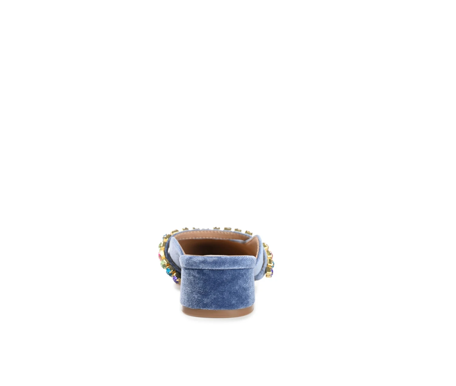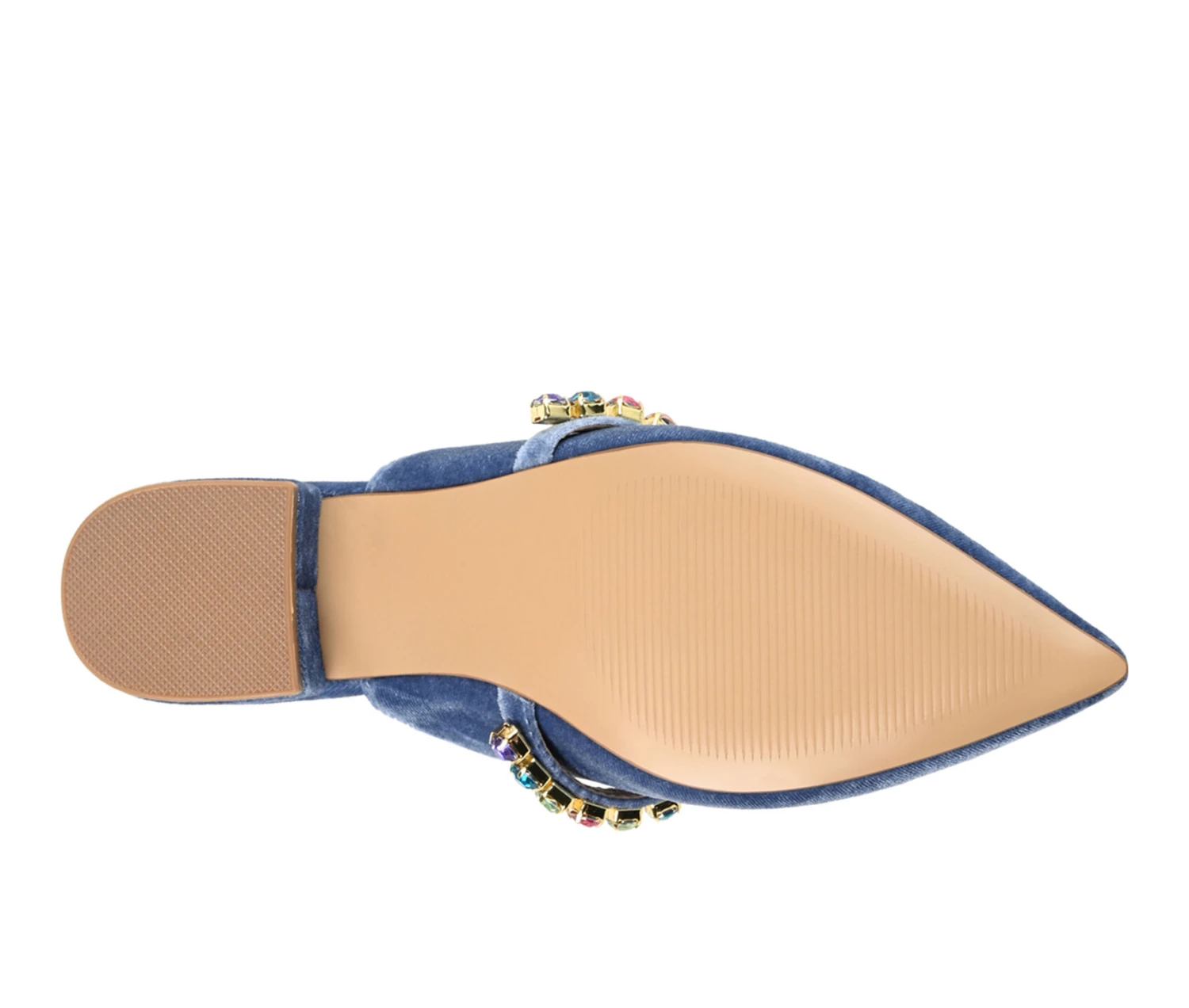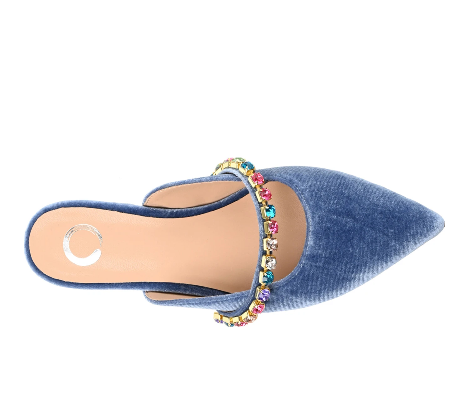 - Add some sparkle to your look with the Jewel flats by Journee Collection. This velvet mule is as easy as it is stylish, thanks to the gemstone-covered strap and padded insole. A pointed-toe and a tiny covered block heel complete the silhouette for an elevated look.