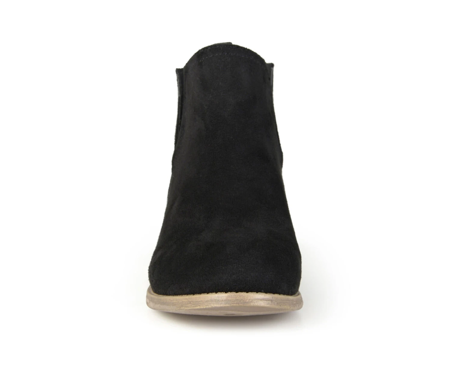 - Show off a trend-setting look with split ankle booties by Journee Collection. Soft faux suede uppers rise to the ankles and highlight chic side split detail. Top-stitching and faux woodgrain stacked block heels complete the design.