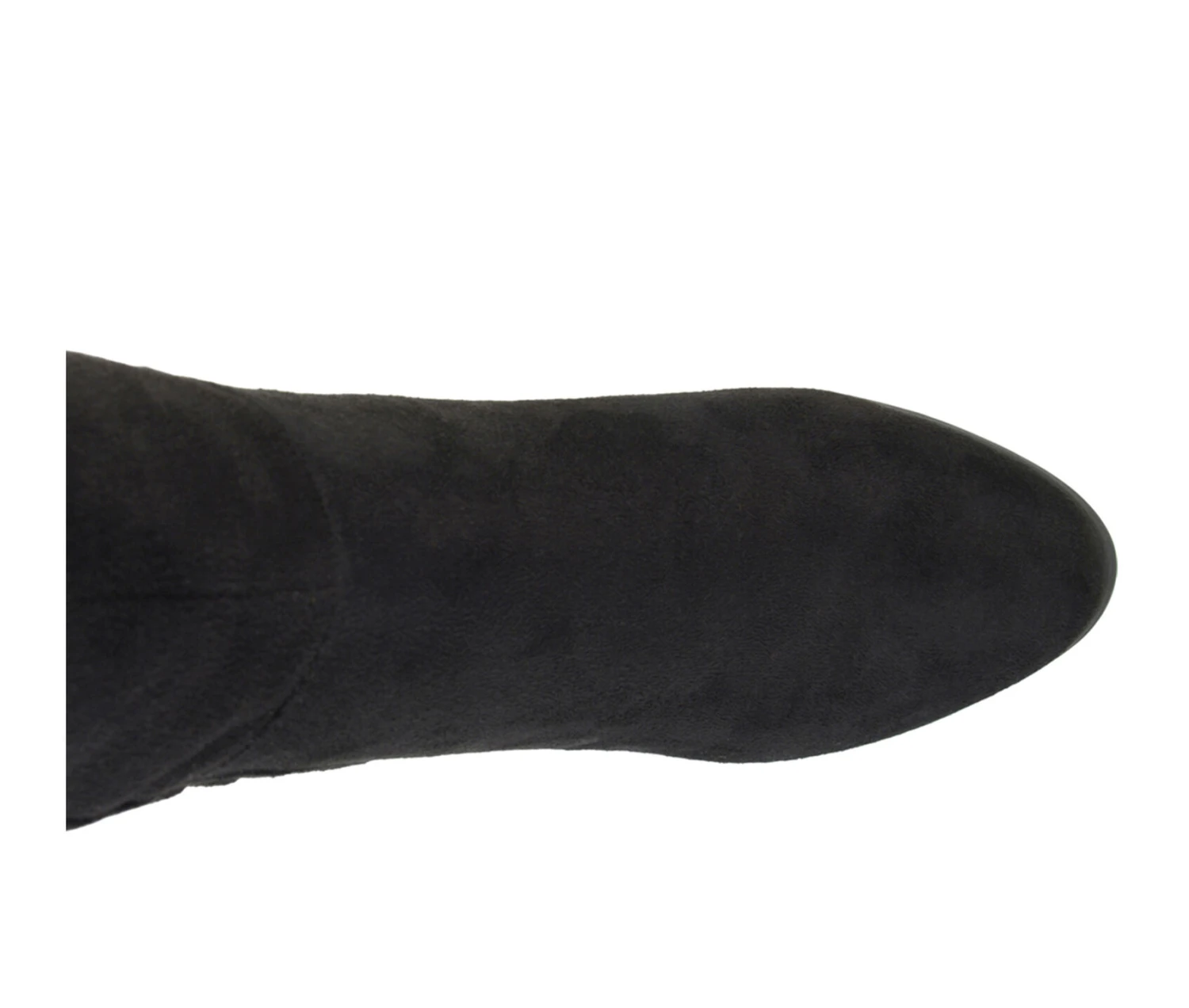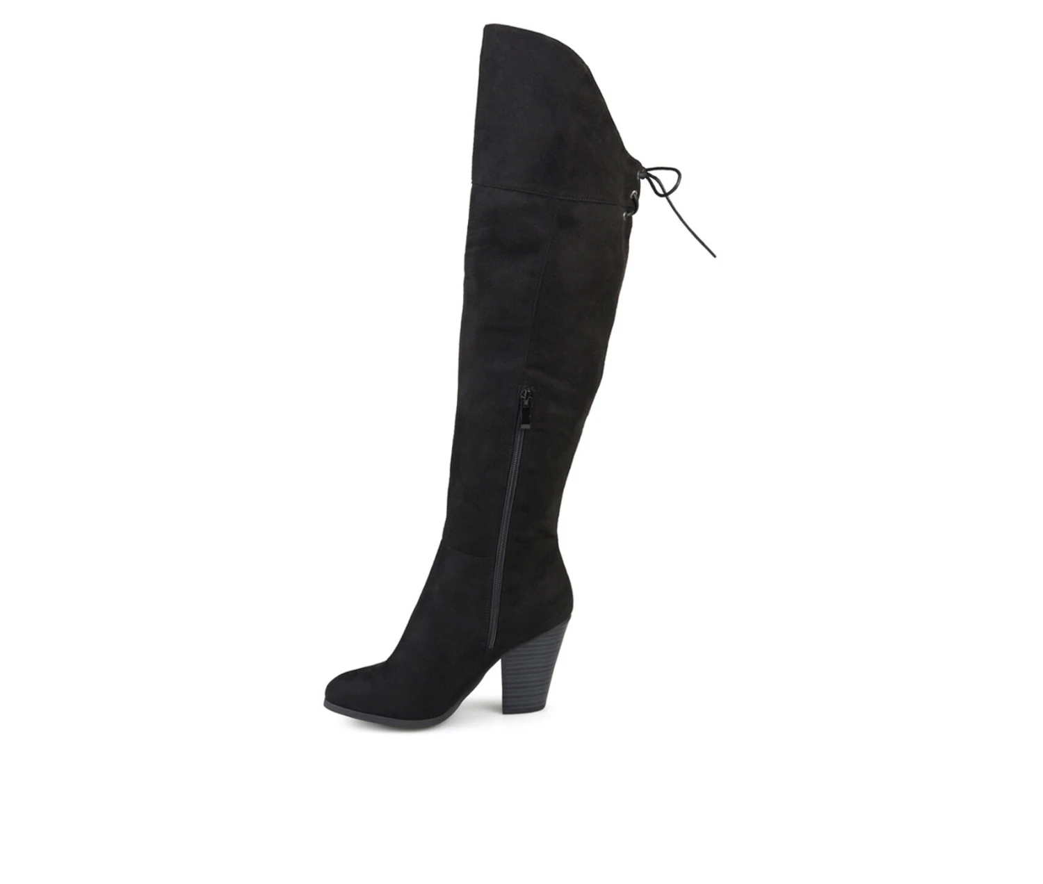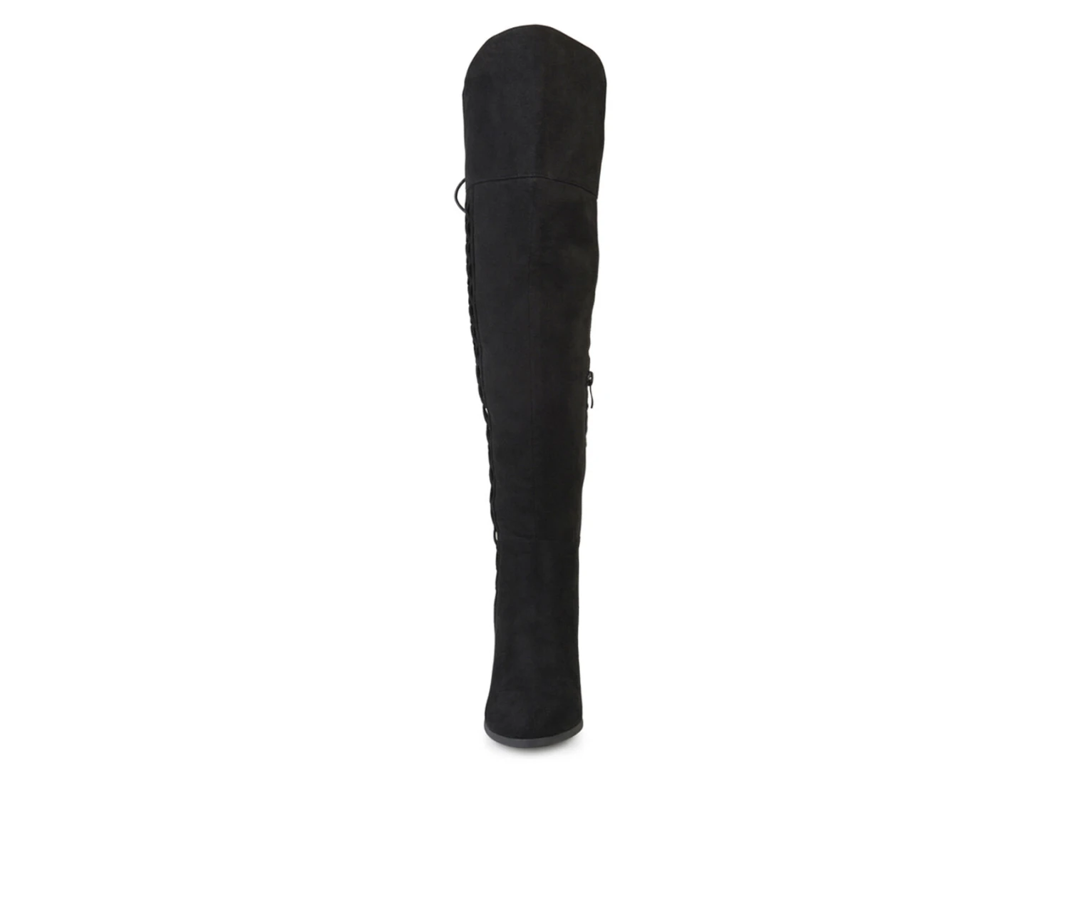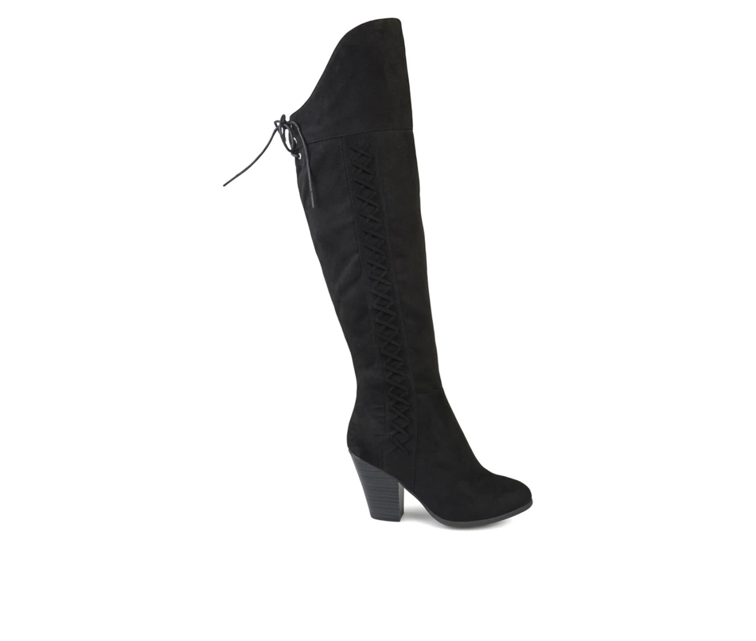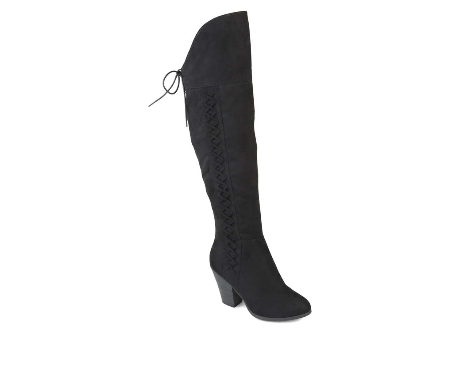 - These trend-setting over-the-knee boots by Journee Collection are made with premium faux leather uppers, with a raised vamp that covers the knee, and lace detail on the side and back. Faux woodgrain outsoles and block heels provide style to complete the design.