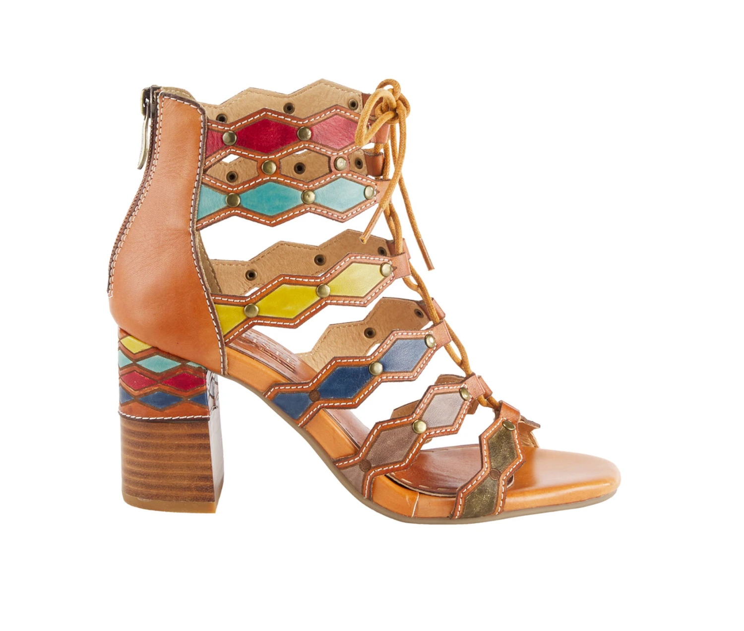 - Dance the night away in these eclectic heels. The back zipper closure makes it super easy to slip on and off. Lace up detailing at the front makes it perfect for fuller feet. The multi color straps will match with any outfit and the studs give it the perfect amount of spice. Artdeco is the embodiment of lavish.