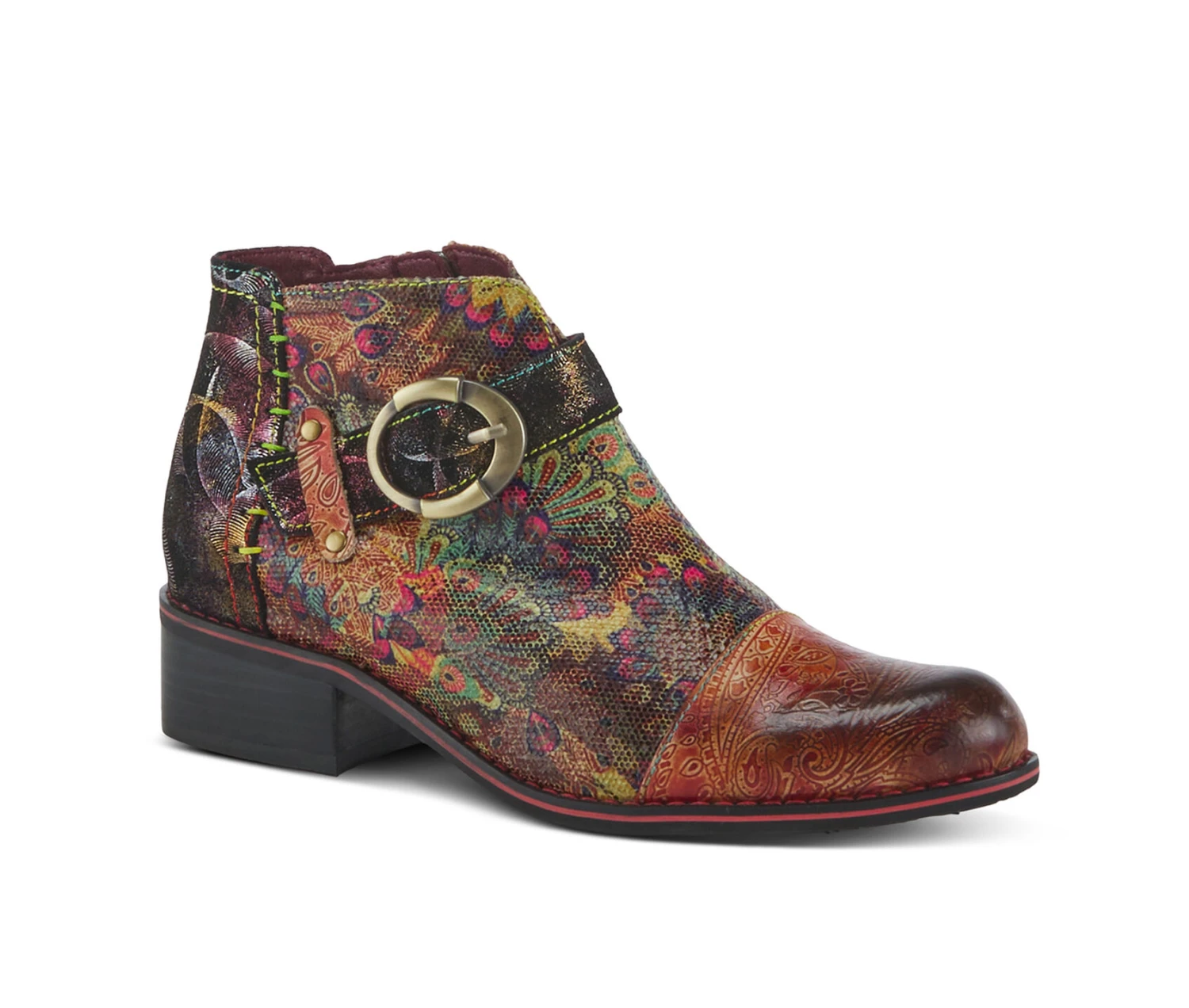 - This western-inspired boot features a stylish brushed and burnished toe box and a convenient zipper closure for easy on and off. The boot’s abstract hand-painted upper is accented with a decorative buckle and rainbow stitching, adding a pop of color and a touch of whimsy to the design. Overall, this boot is a perfect combination of fashion and function, ideal for those who want to make a statement with their footwear.