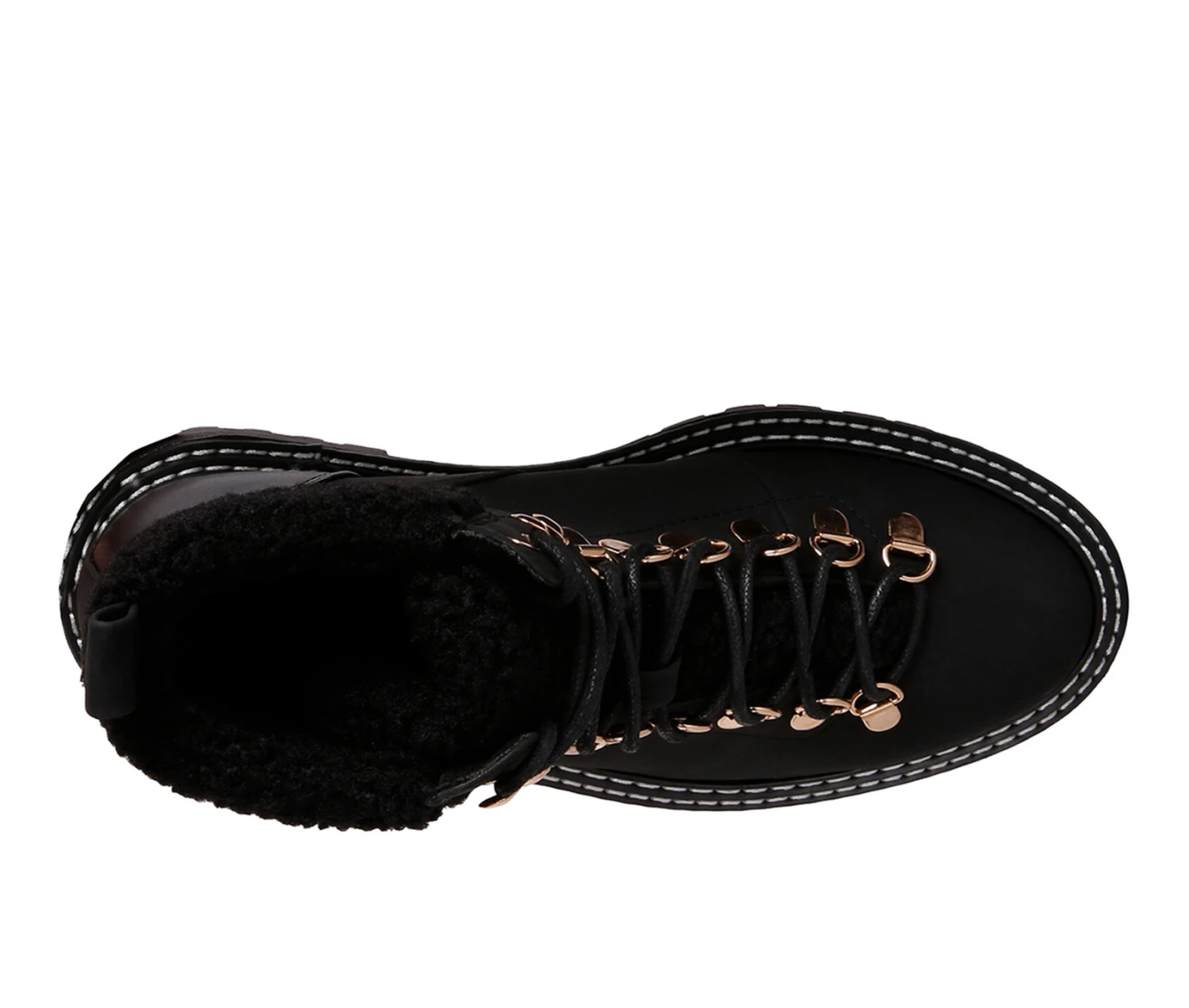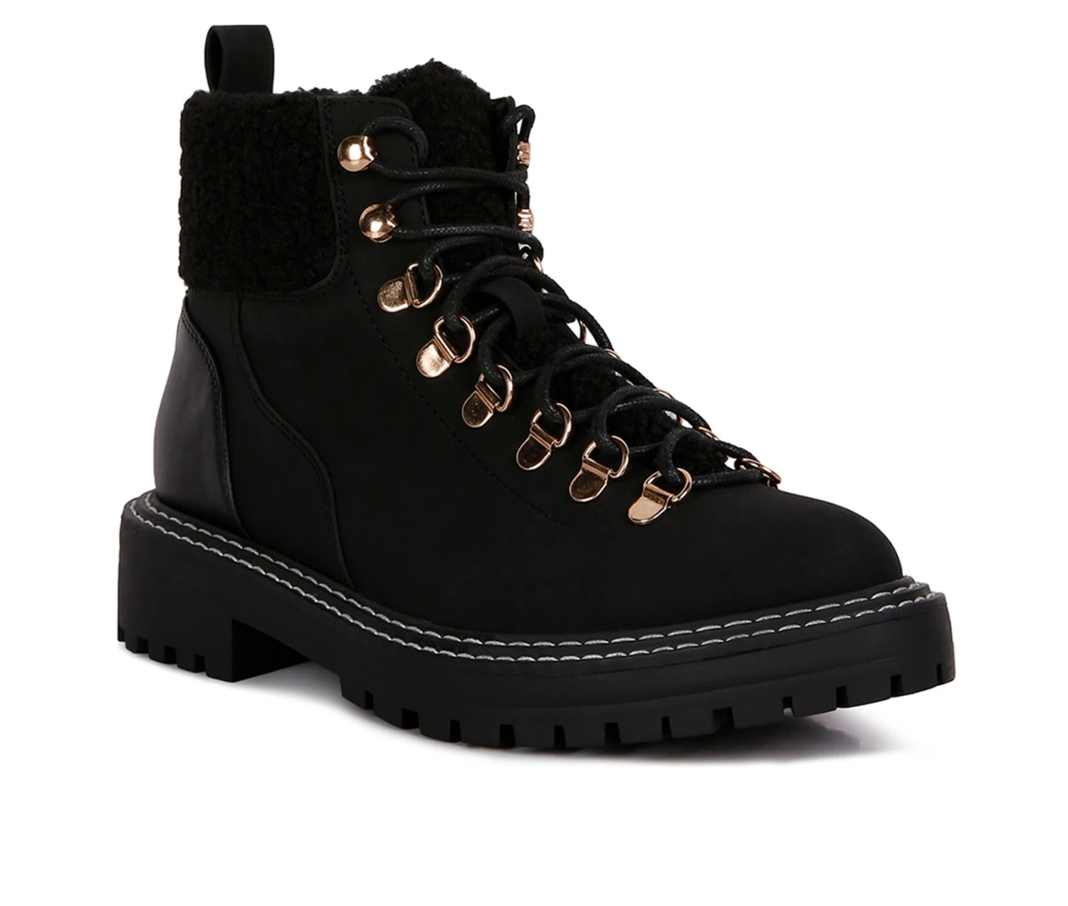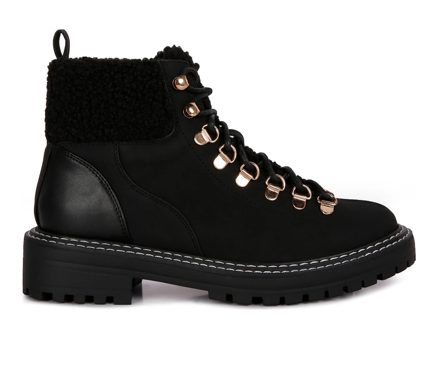 - The shearling collared ankle boot has metallic eyelets which makes this multipanel ankle boot beautiful, it has stitch line detail on the ramp which adds to the look. Has a lightweight groovy lug sole that keeps you safe on surfaces.