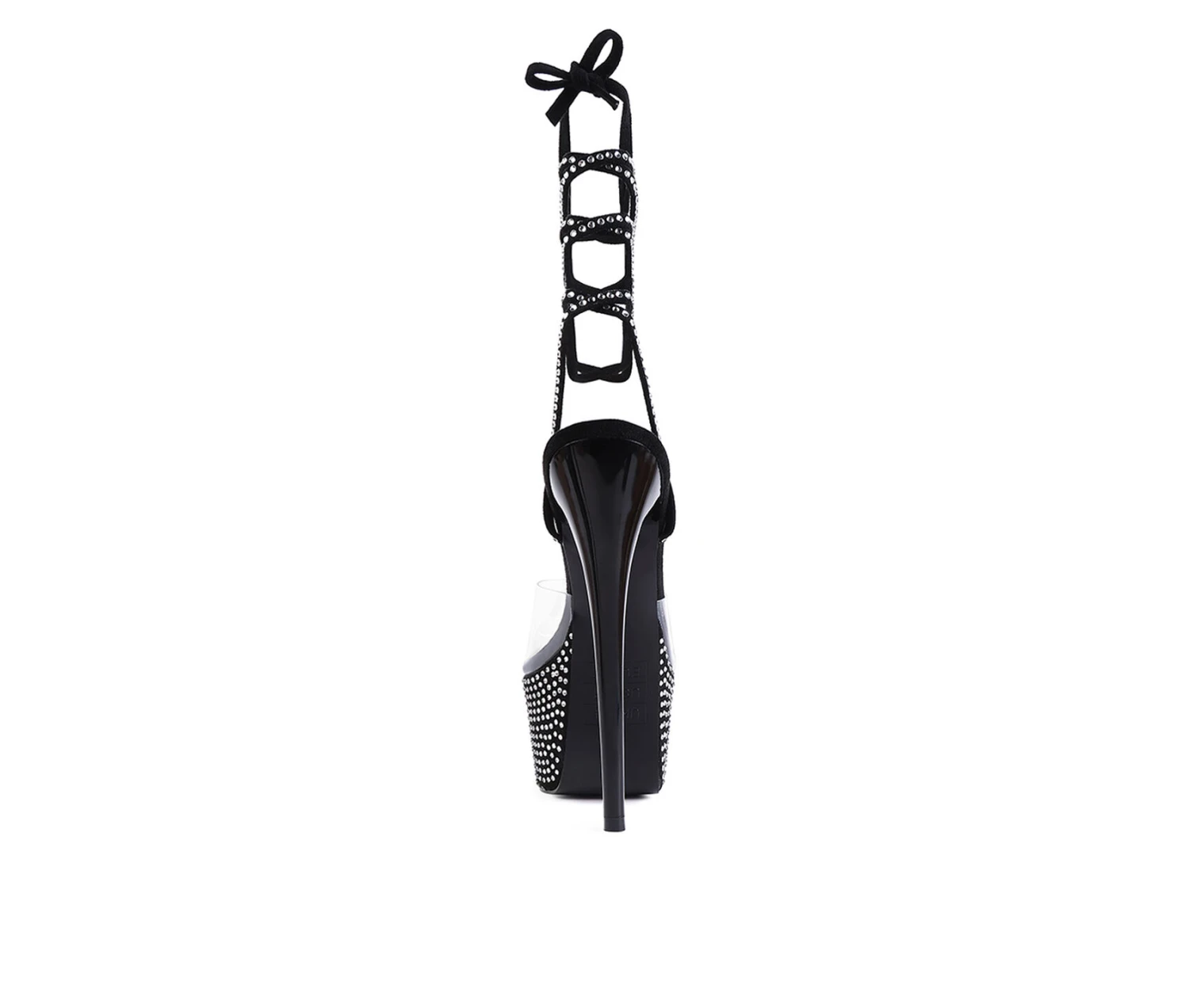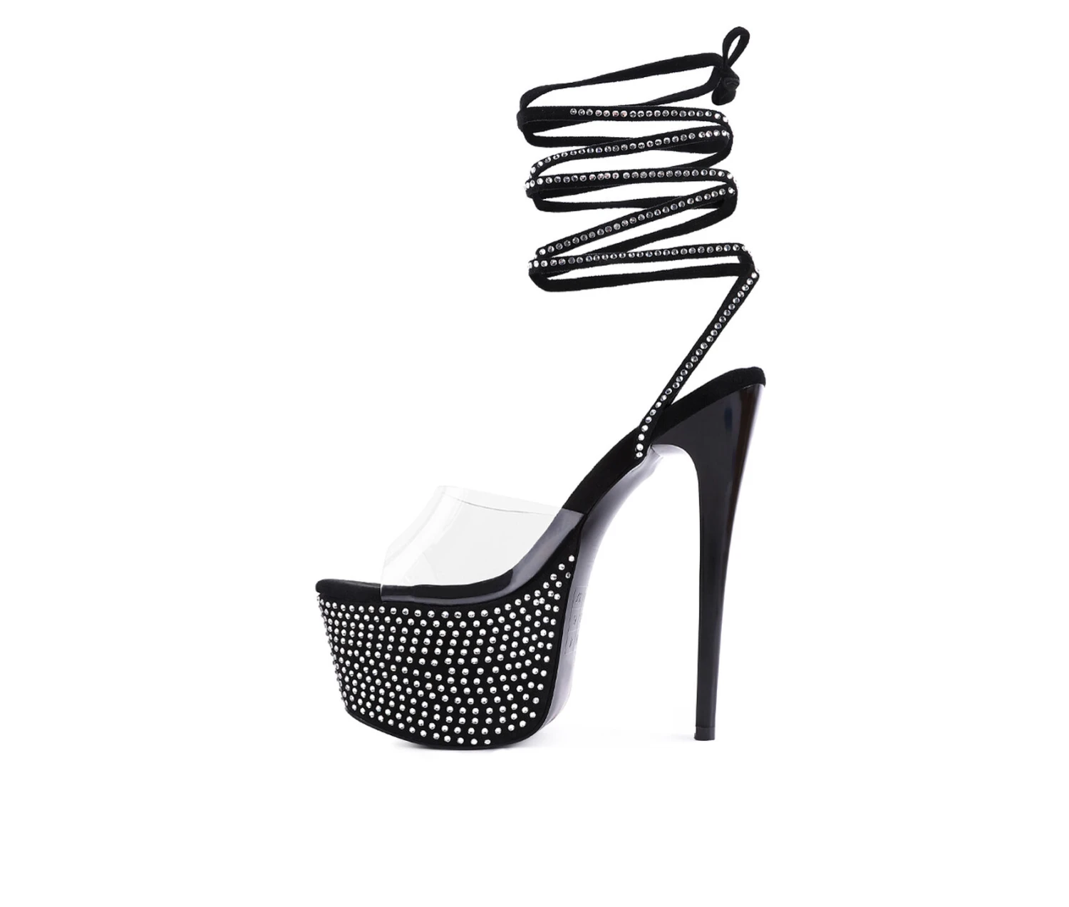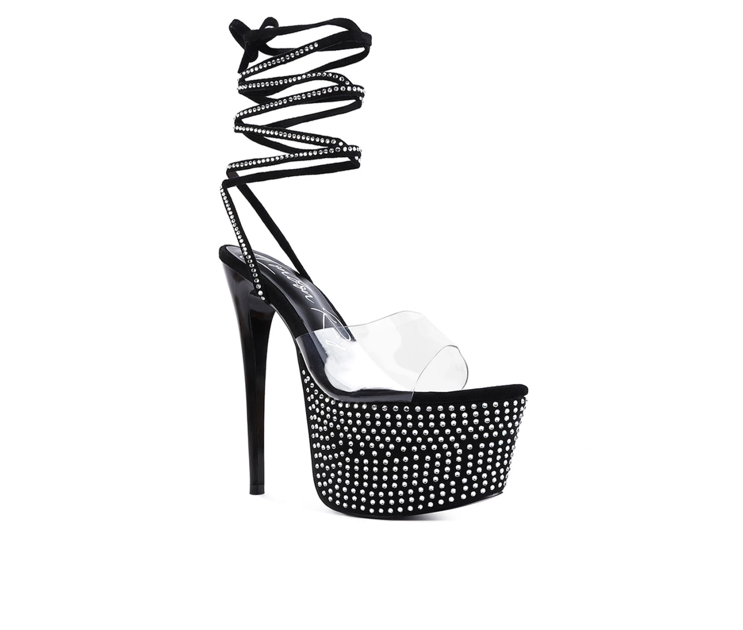 - Centre of attraction guaranteed in these stunning and racy platform heels. The strappy detail is sexy, while the diamante adorning the strap and the wedge is alluring. The strap is clear and hence the focus is completely on the heels. Â