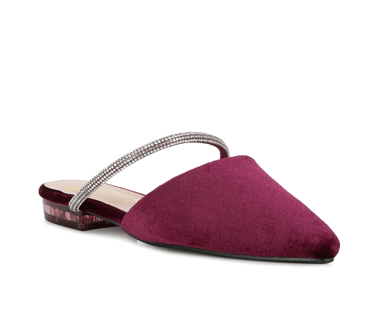 - Pointed close toe velvet mules has diamante strap which adds to the look. The low clear heel complements the structure. It has lightly padded insole which makes these casual flat sandals comfortable and cozy.