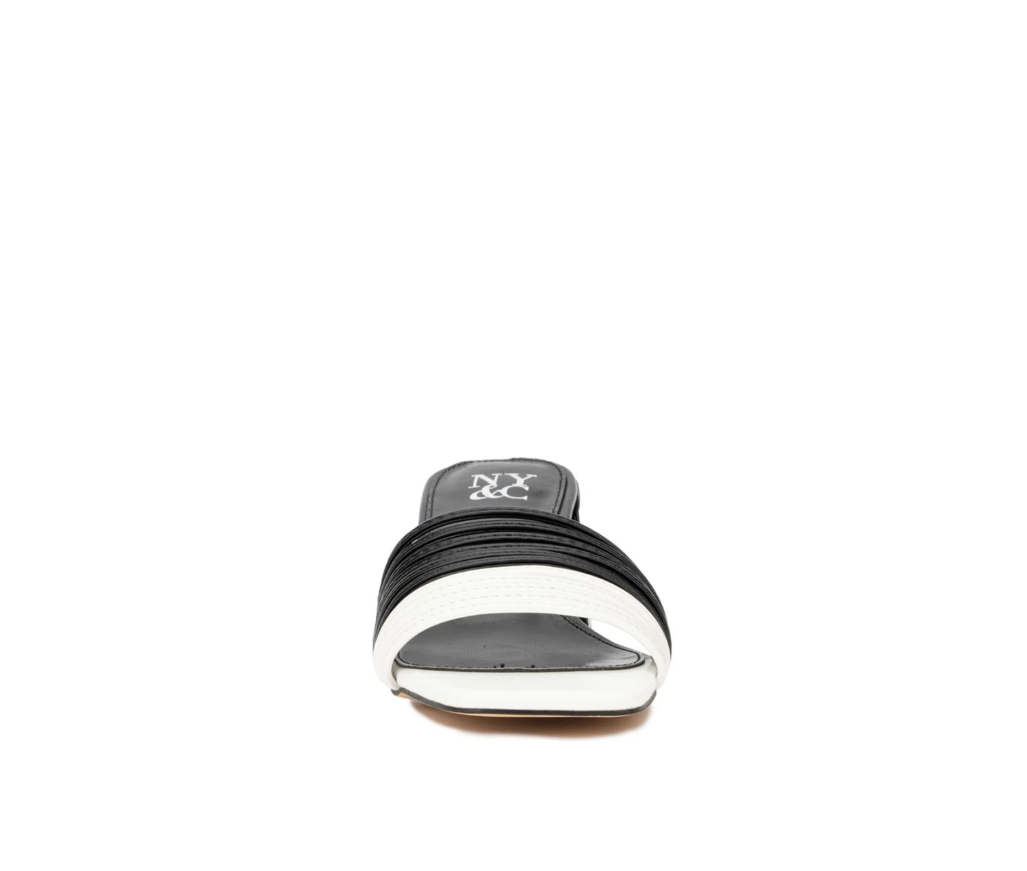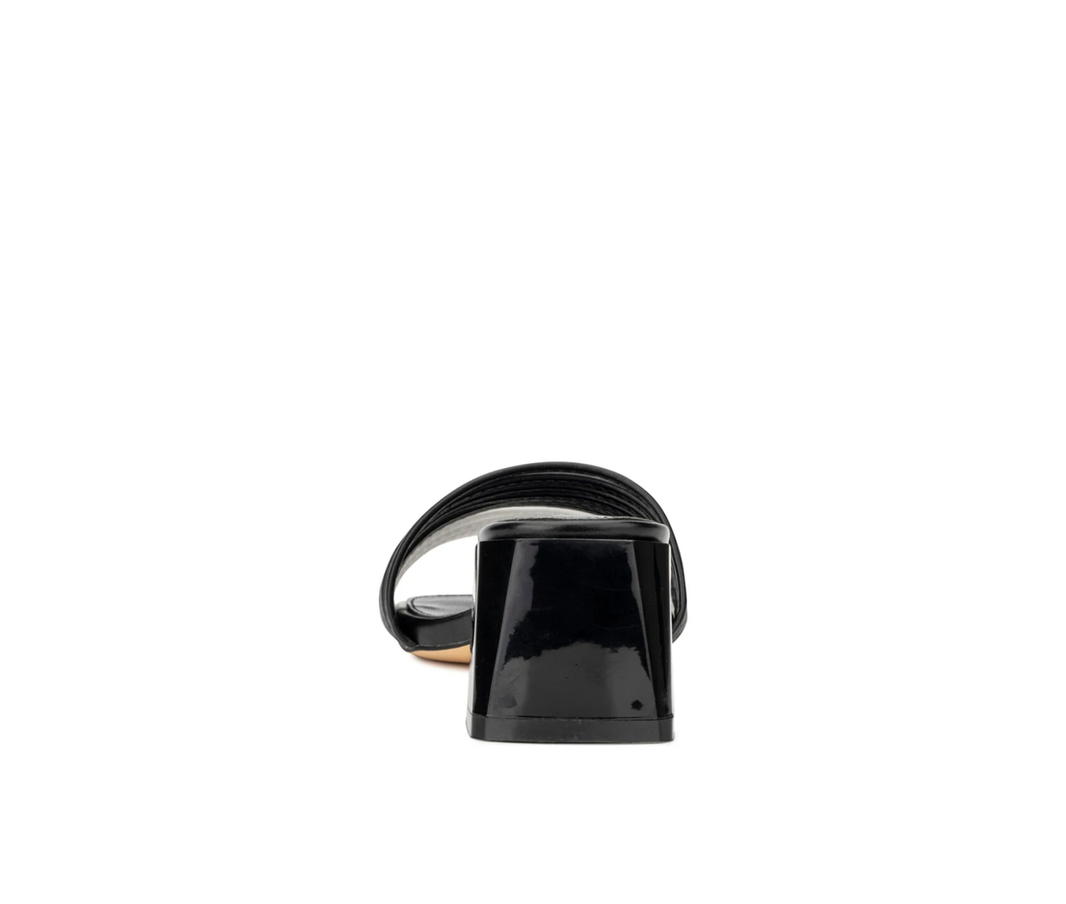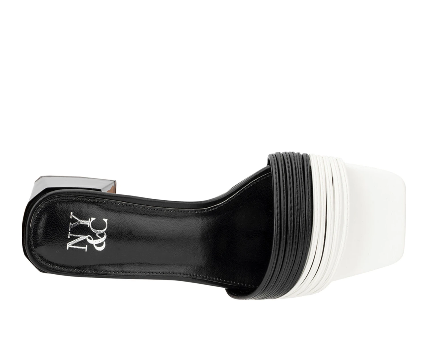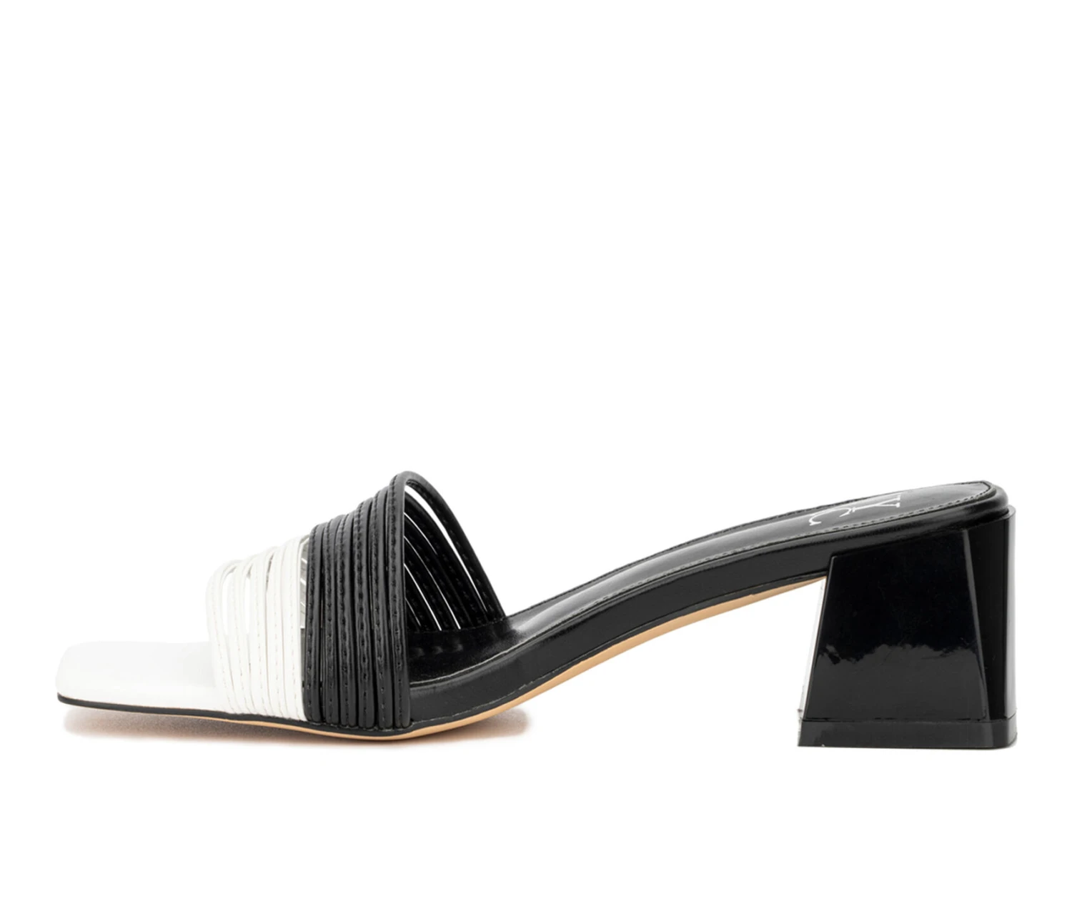 - The Hera slip-on heels feature a dual tone strappy design, squared open toe and a block heel.
