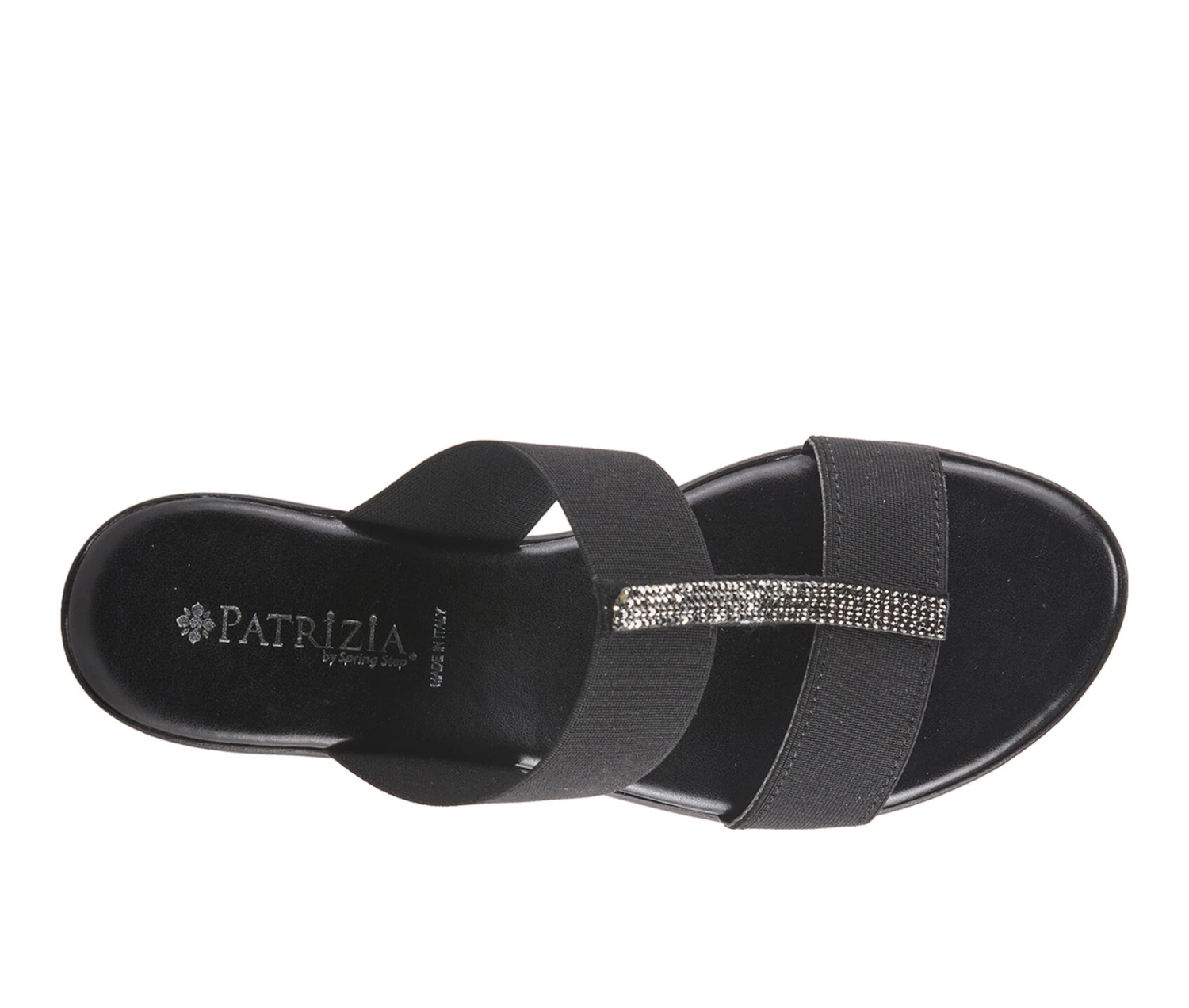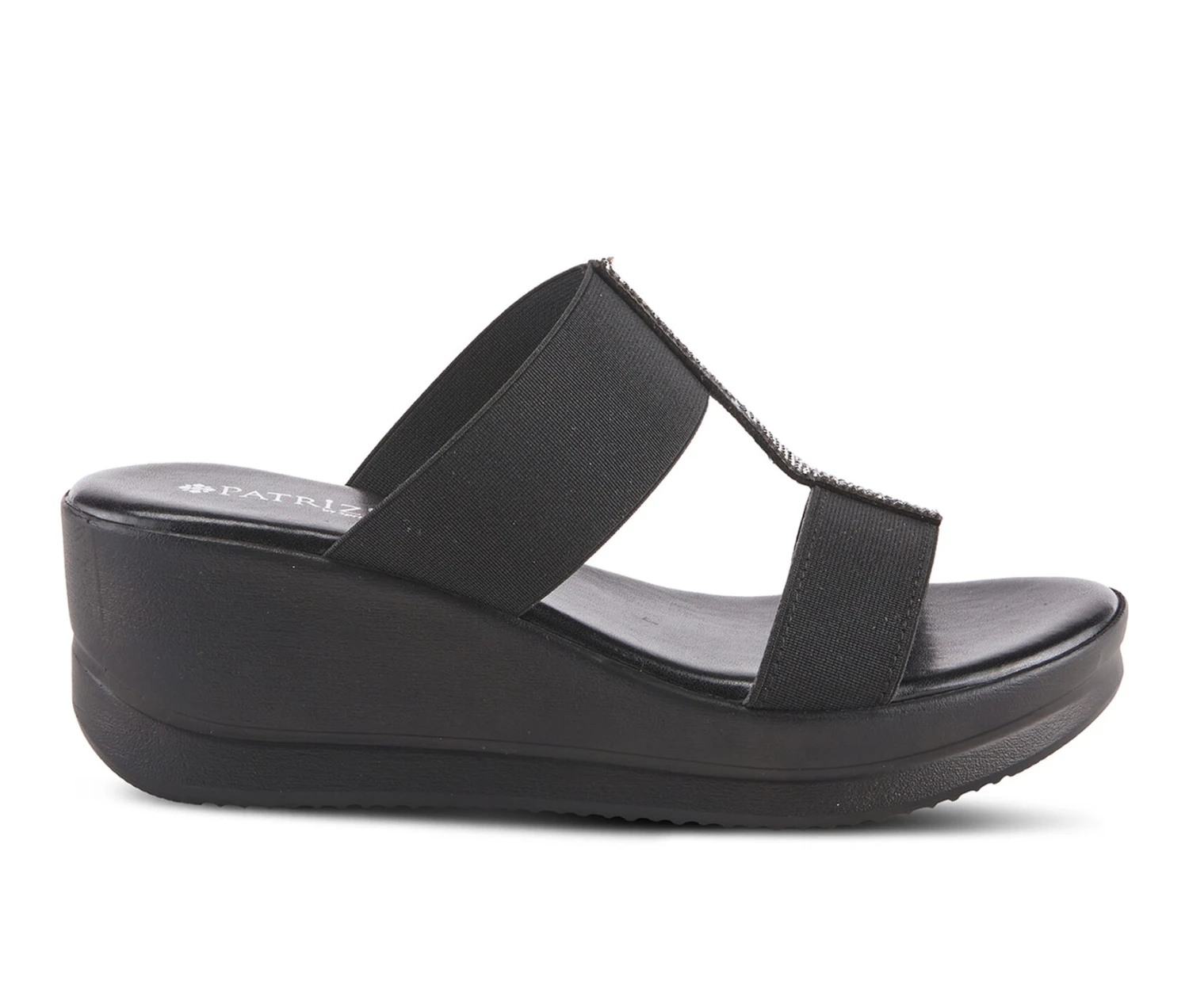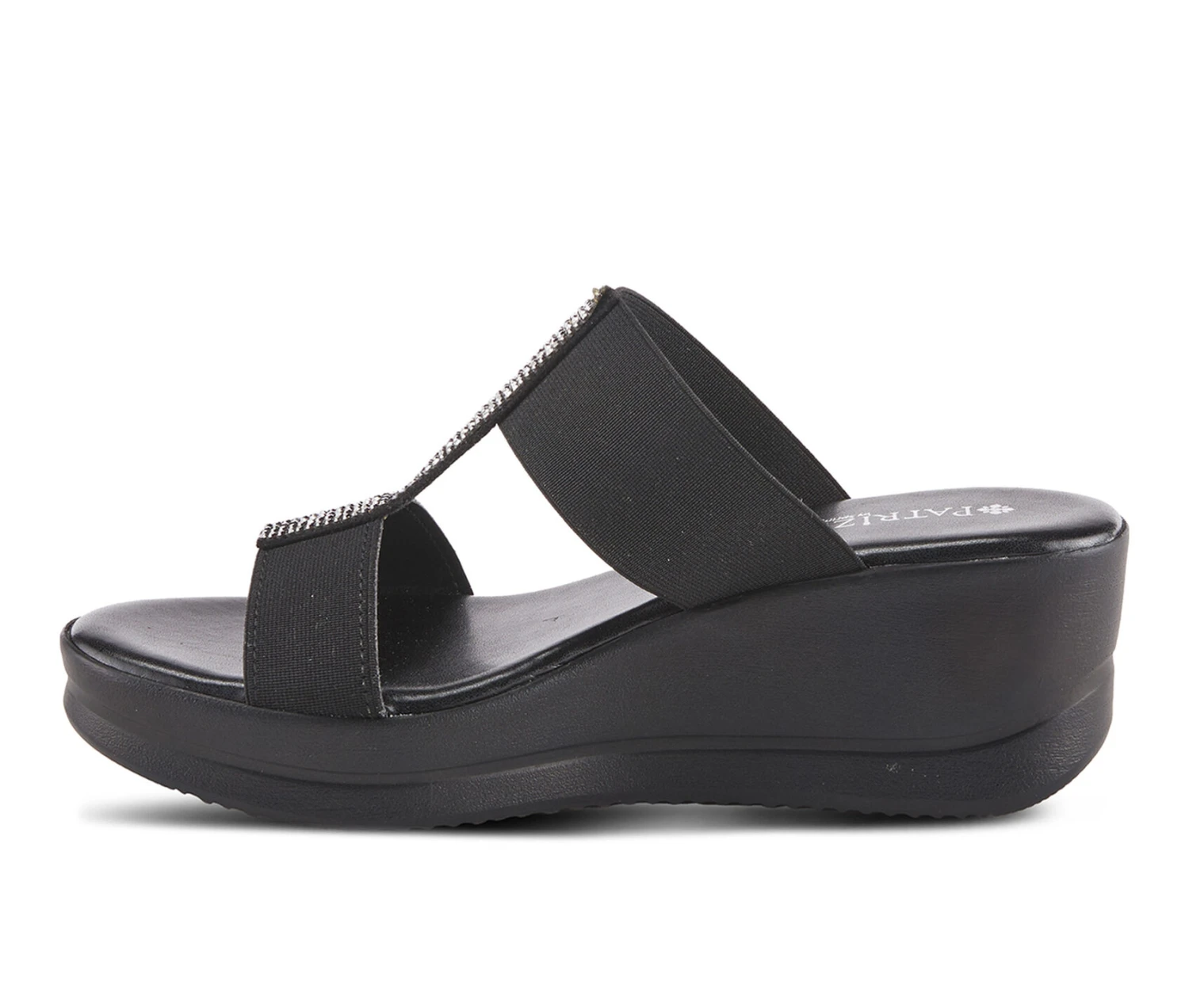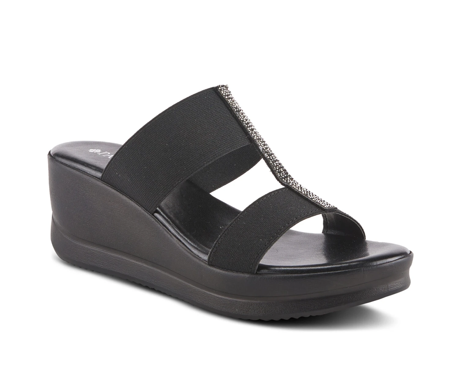 - Comfy and elegant slide sandal wedge adorned by rhinestones straight across two elastic straps on a soft insole for comfort and support.