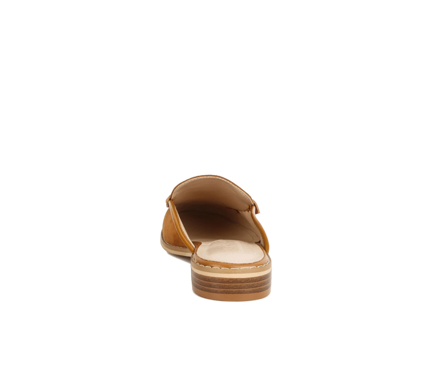- Chic and comfortable, the only two things you need in a shoe which is versatile and appropriate for all occasions. This pair comes with a low wooden heel and tassle detailing and mock stitch detail, which provides an rich dimension to the mules. It is slip on and includes a leather collar lining for extended comfort and luxe look.