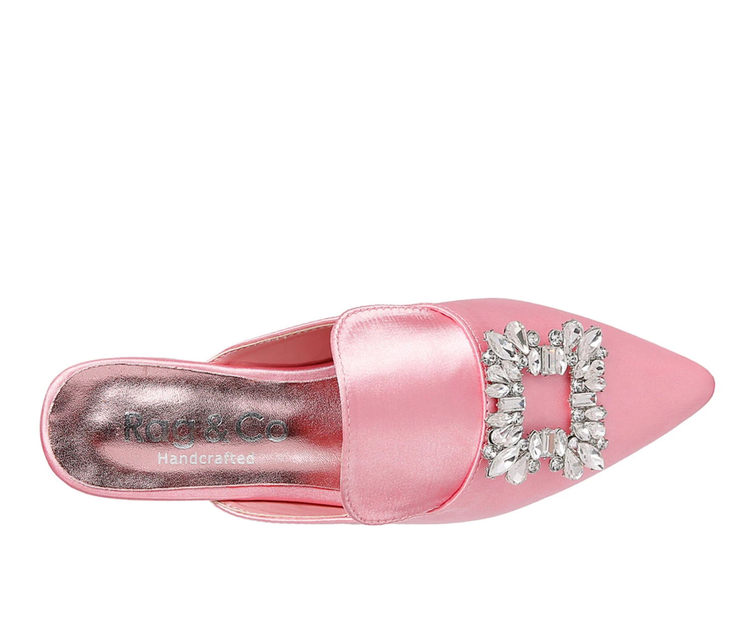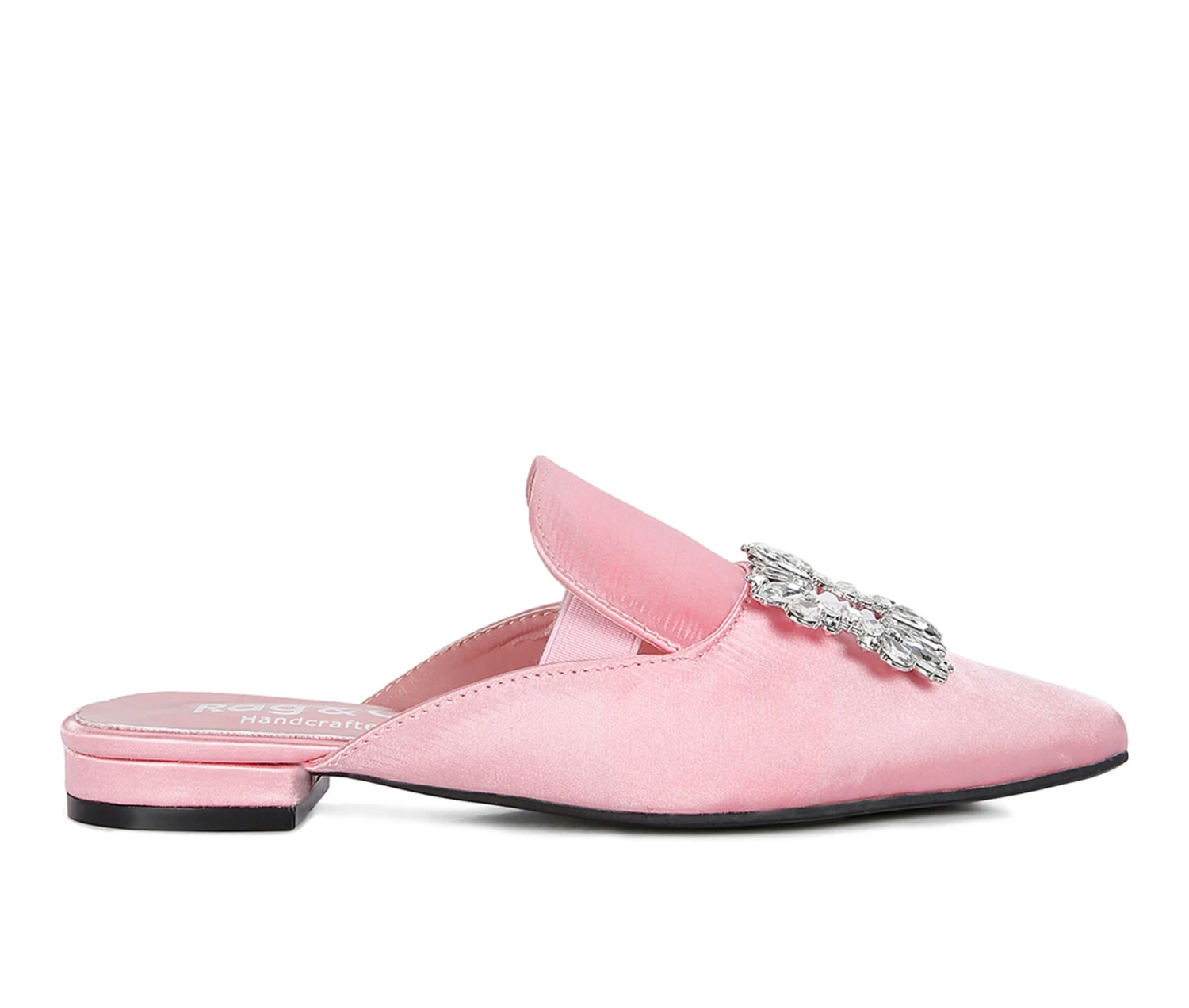 - The slip on mules are constructed with beautiful satin and the diamond buckle on the front takes it a notch up. The soft cushion innersole cuts strain. The mules are a must-have if you want luxury and comfort all in one.
