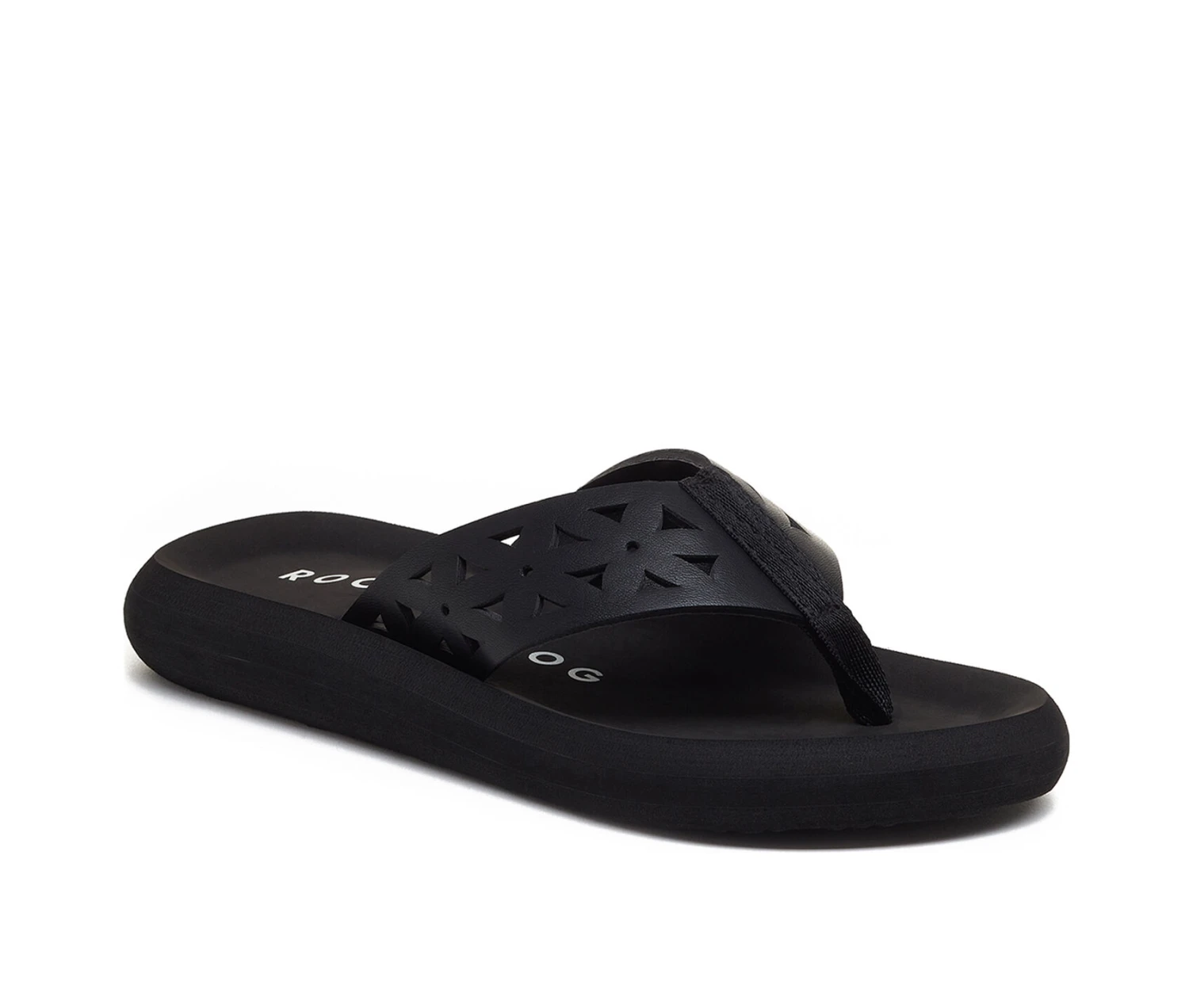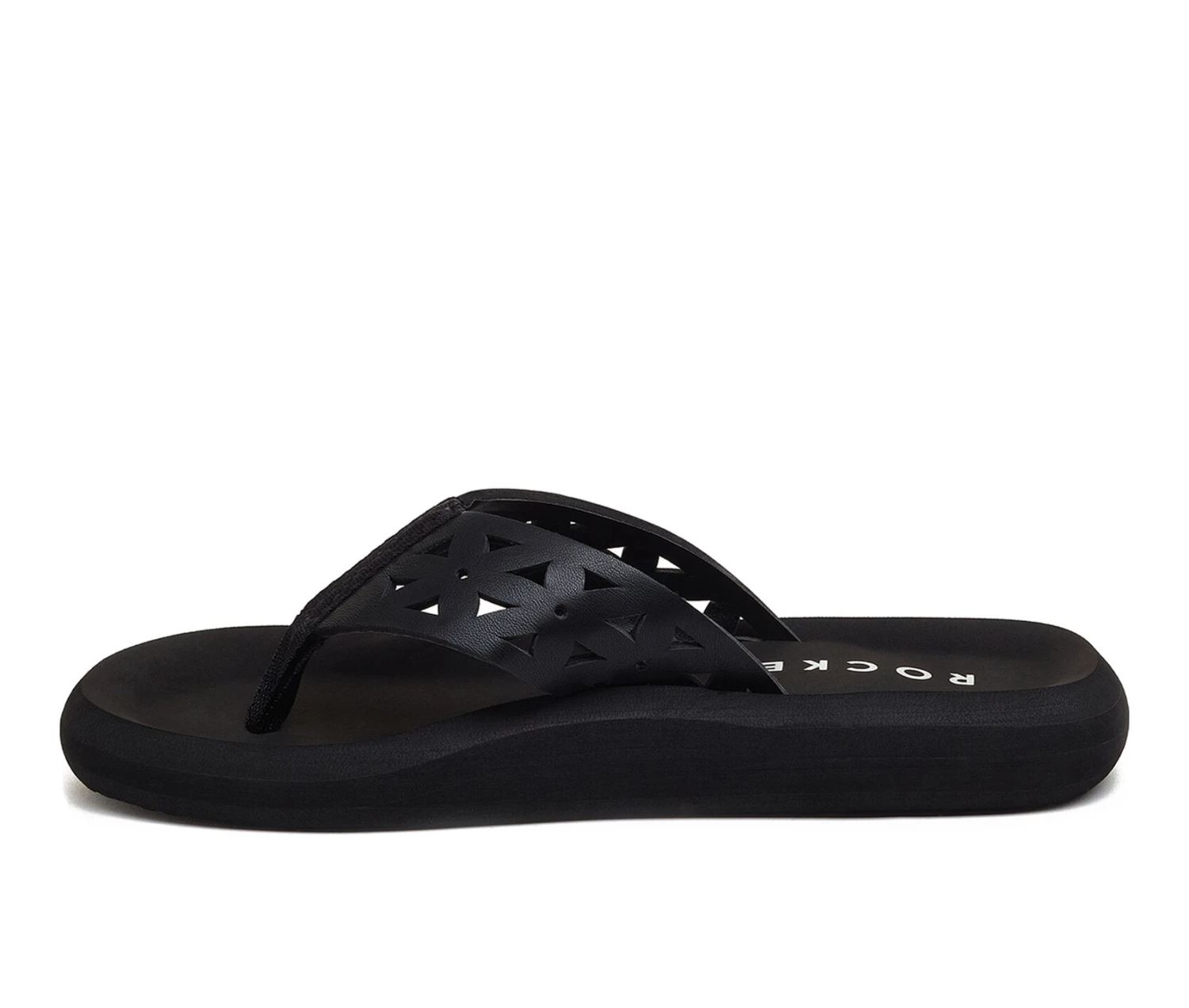 - Women’s Flip Flop Black EVA Footbed, with Pink or Black cutout design faux leather straps
