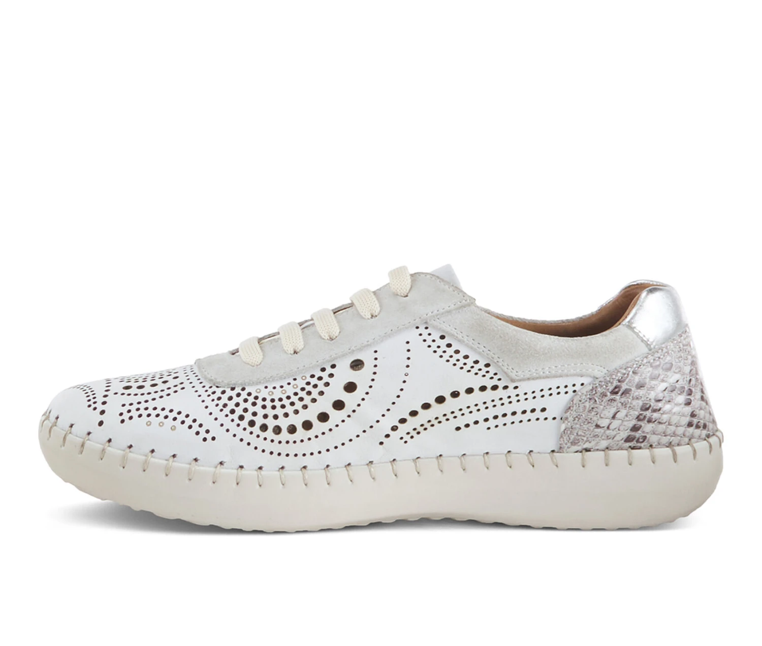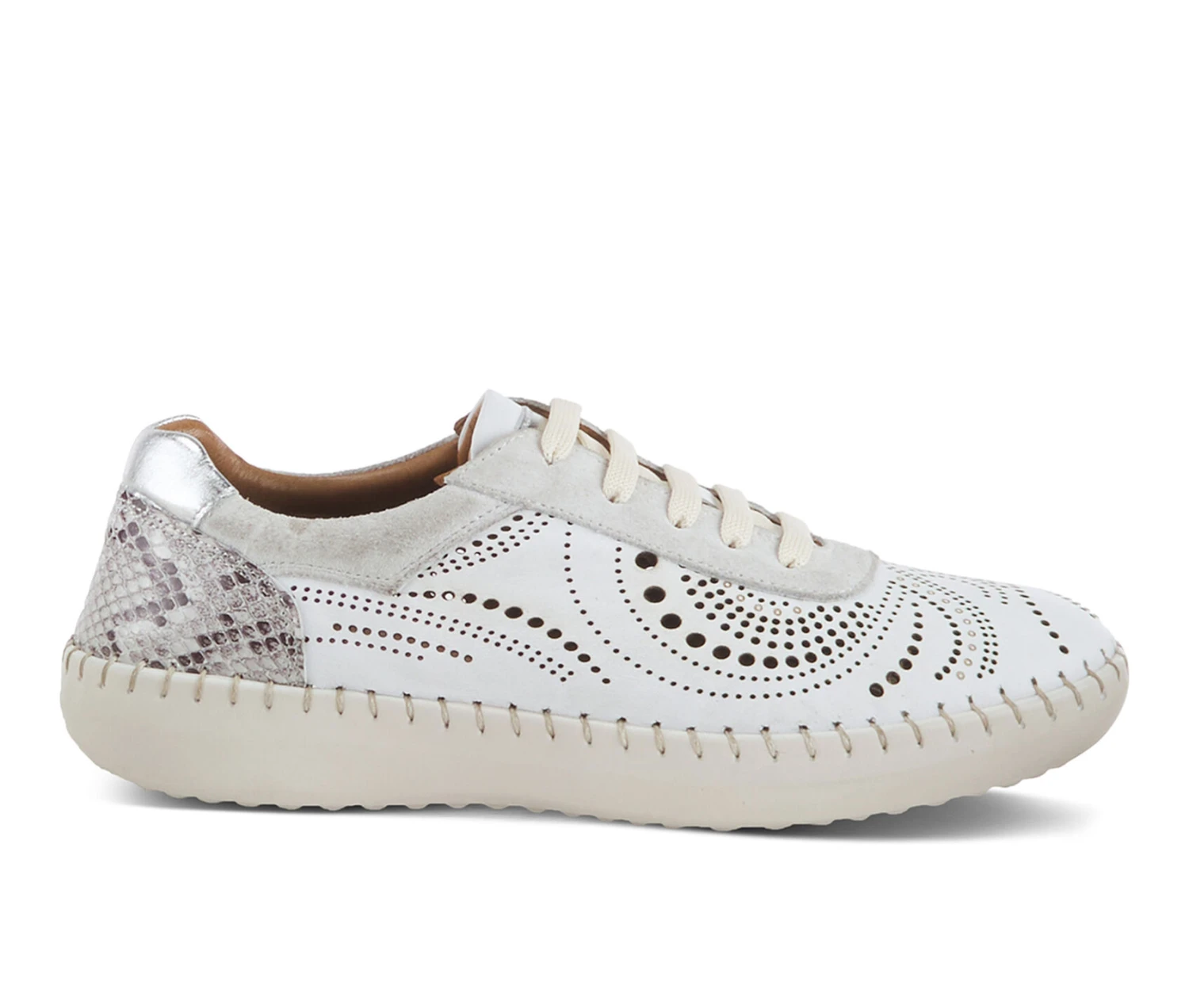 - Calling all fashionistas on the go. Round out your footwear collection with this gem of a sneaker. Mixed media sneaker metallic, leather, suede and snake print featuring elastic laces for the perfect comfort fit.
