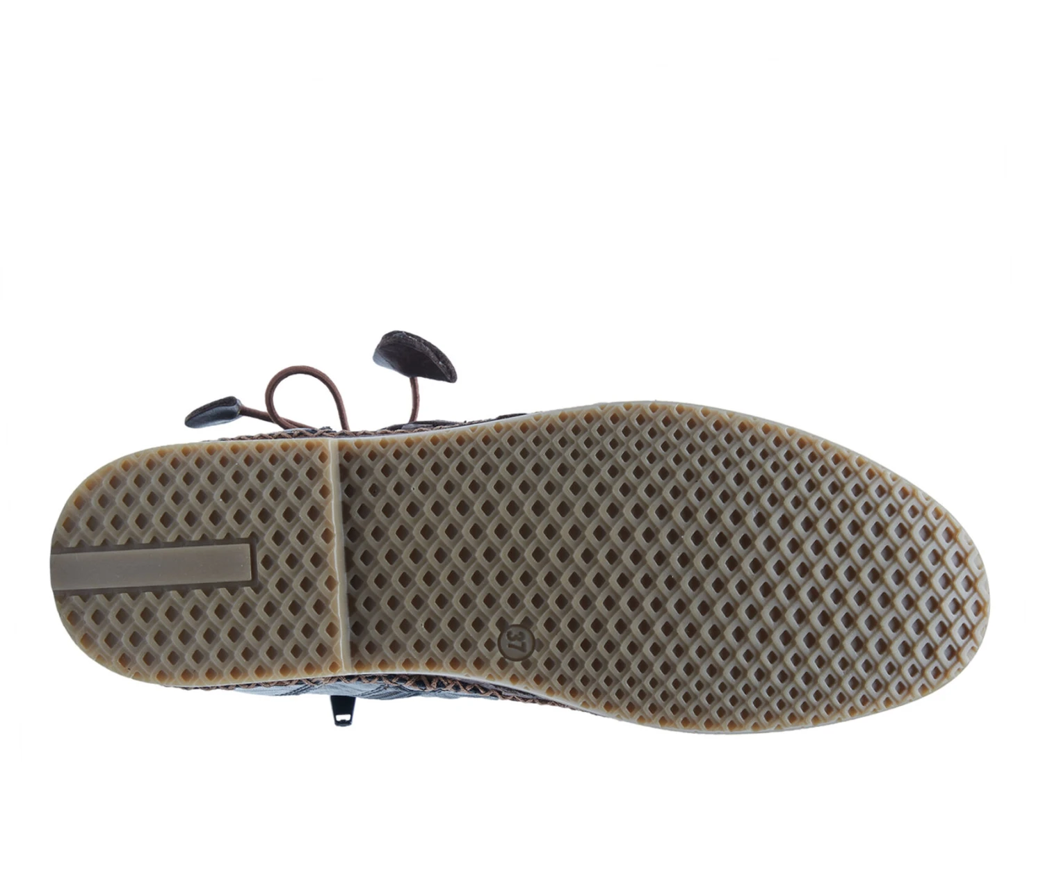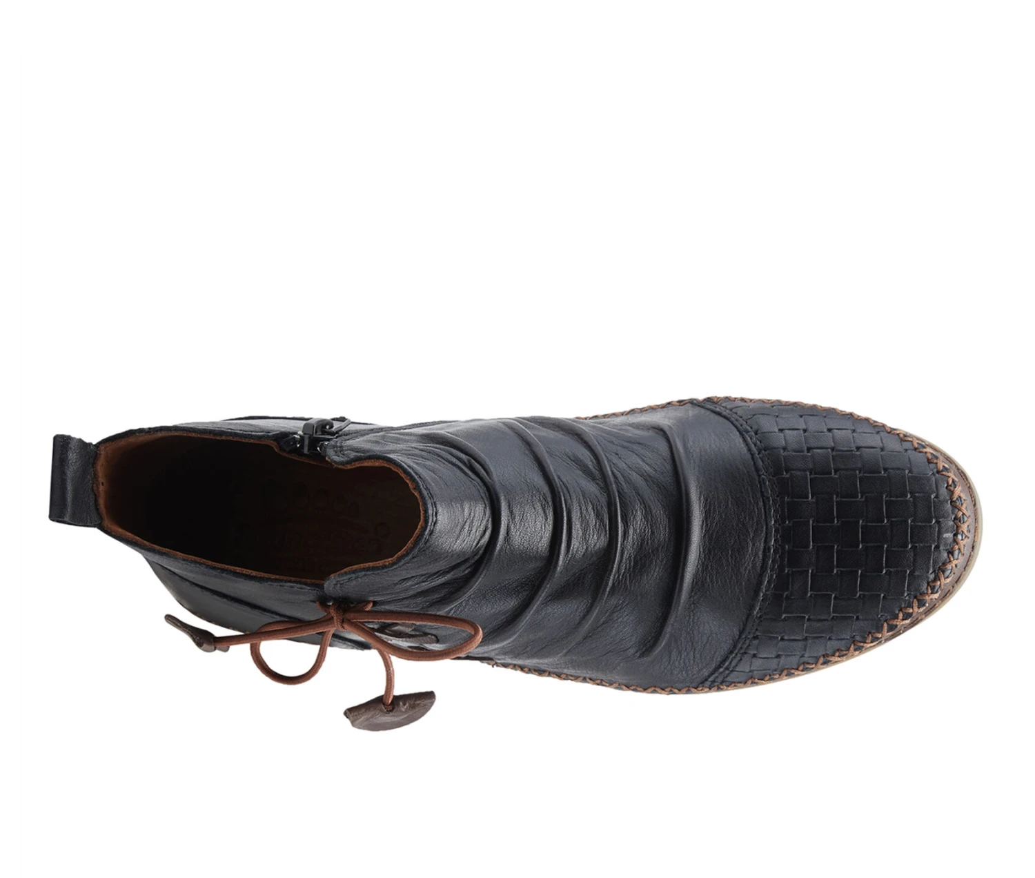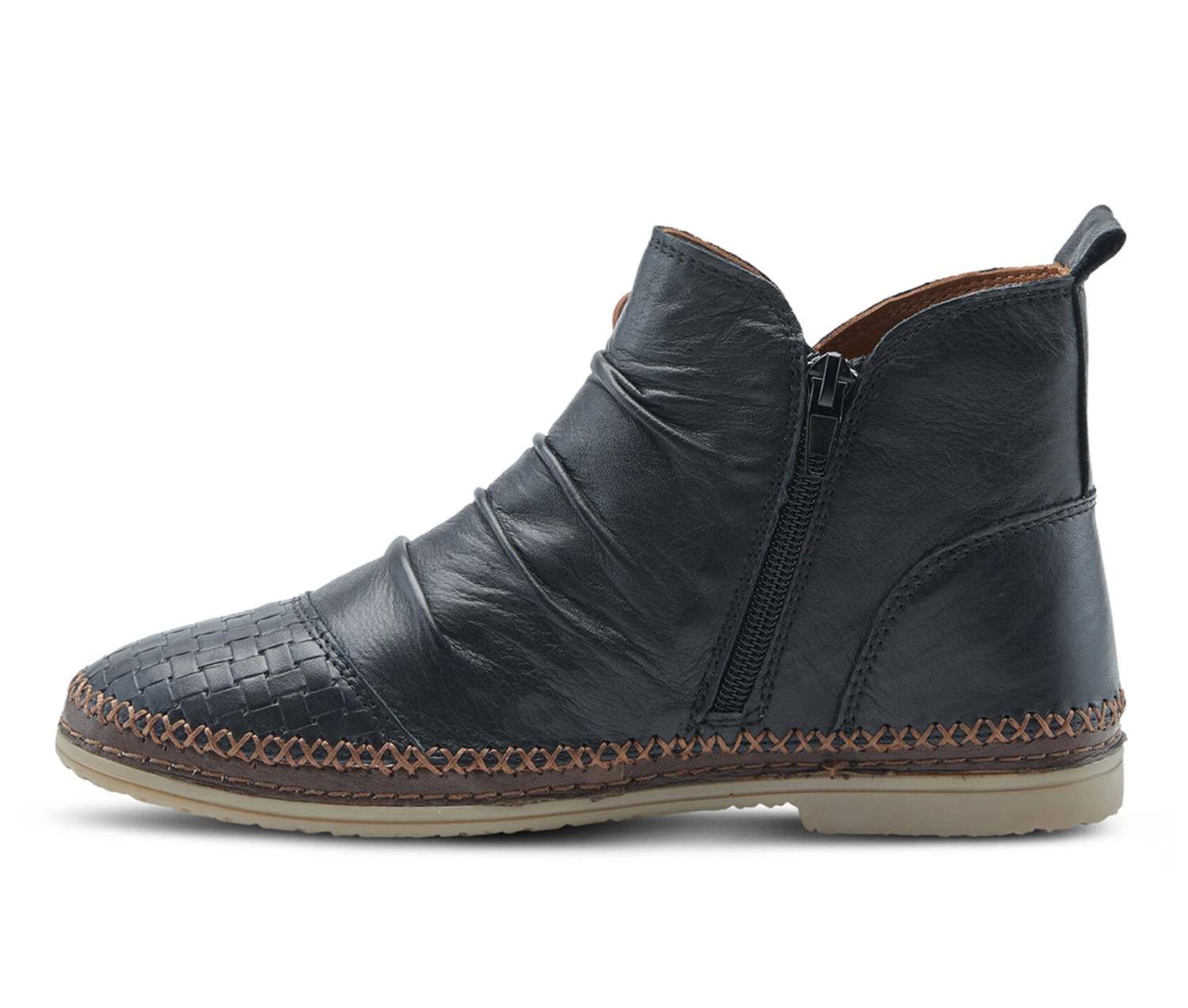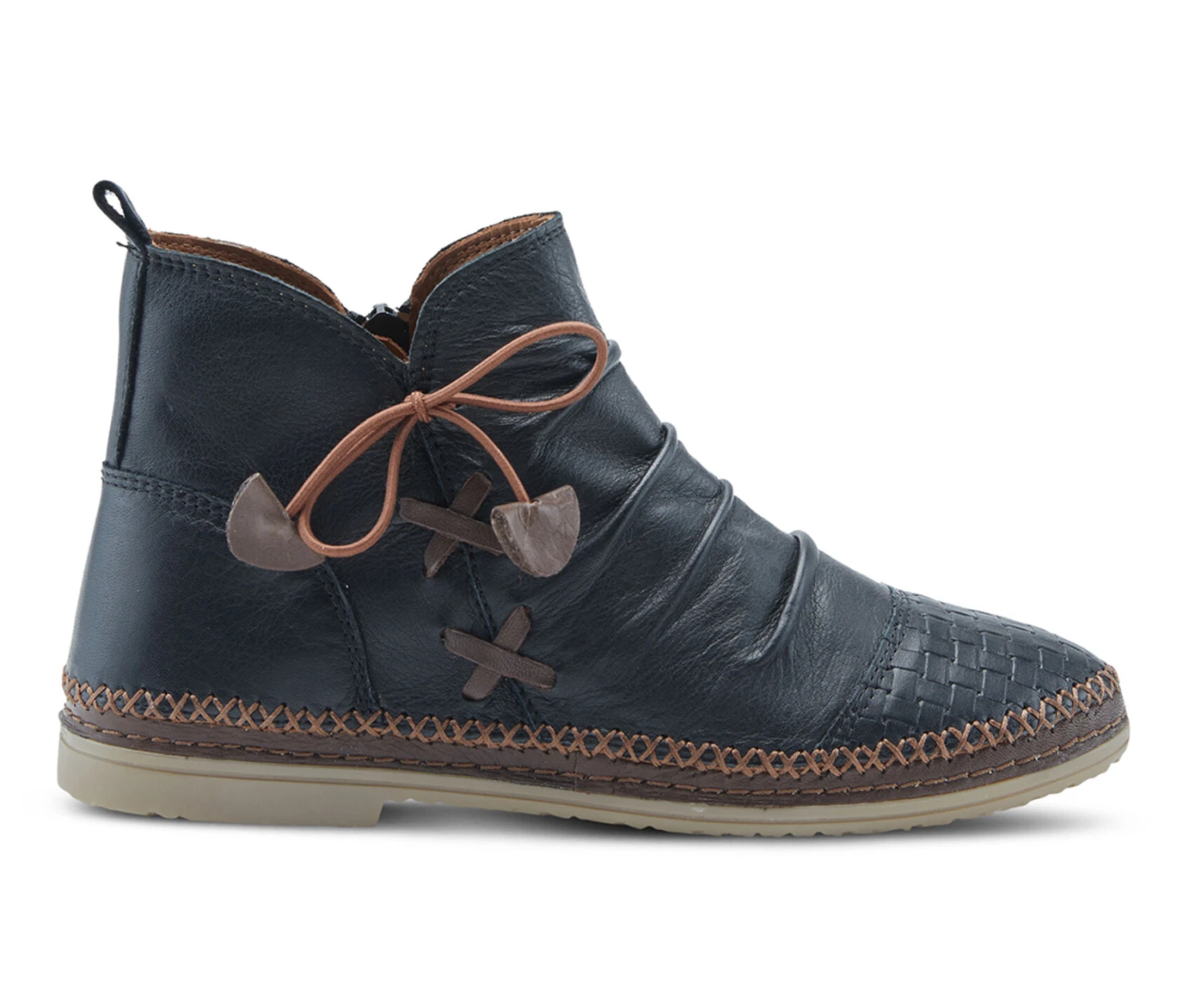 - A butter soft leather bootie designed with a basket weave cap toe and decorative elastic tie detail on one of our most popular, comfortable outsoles.