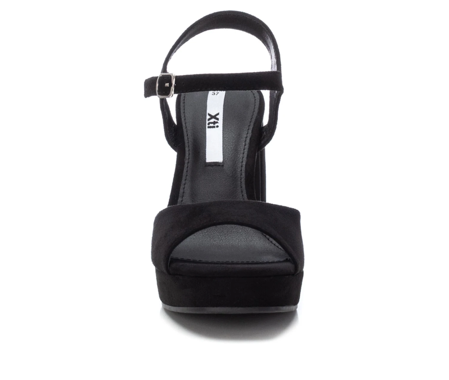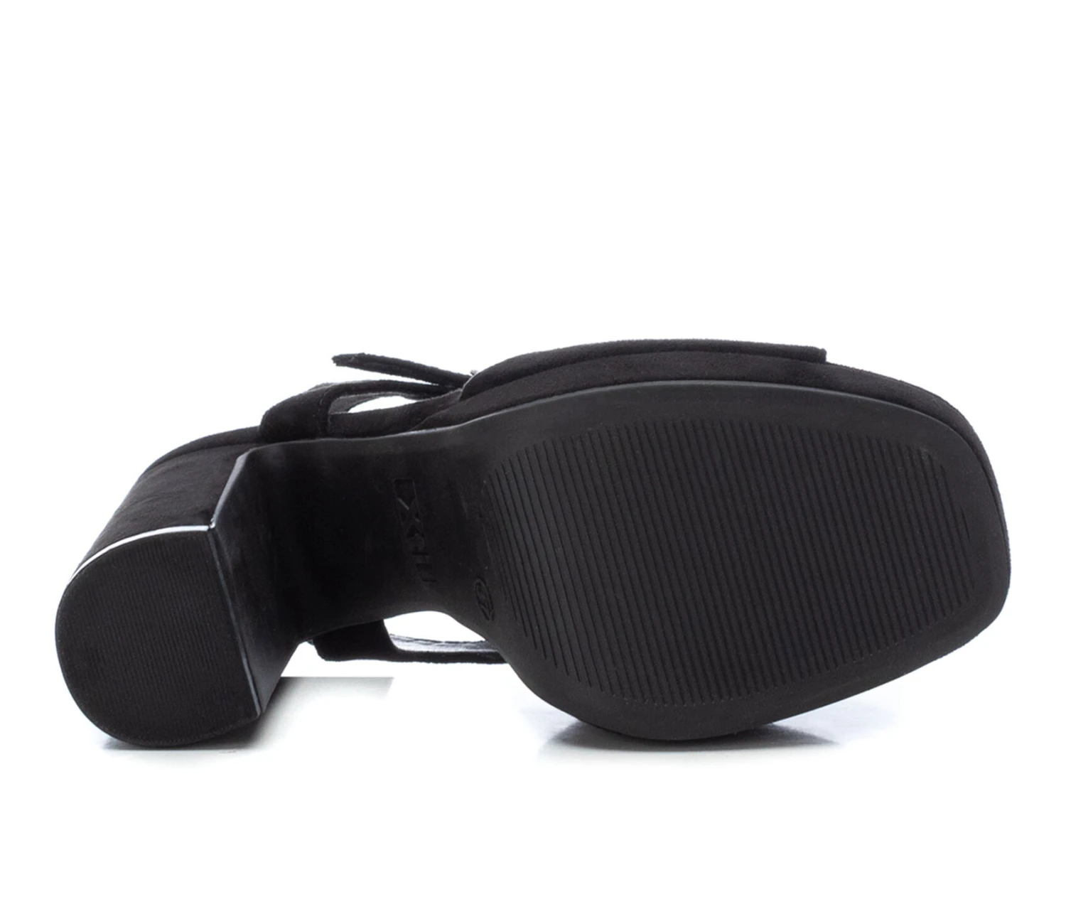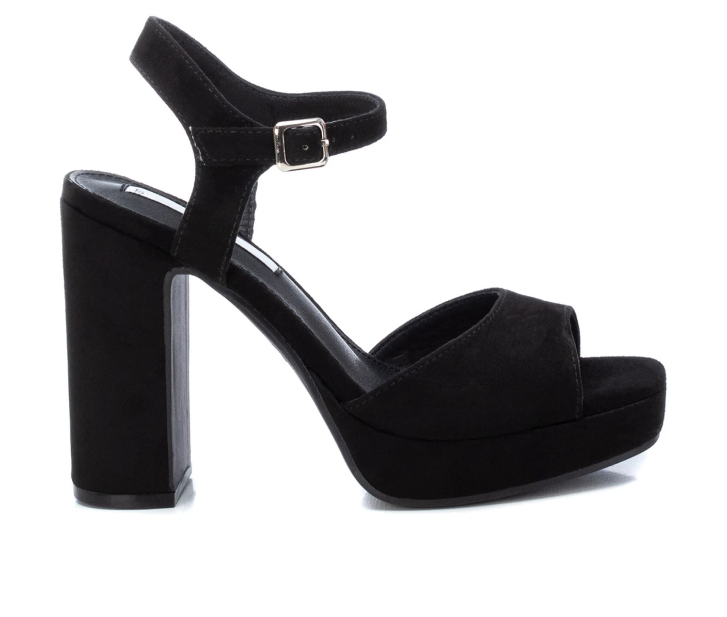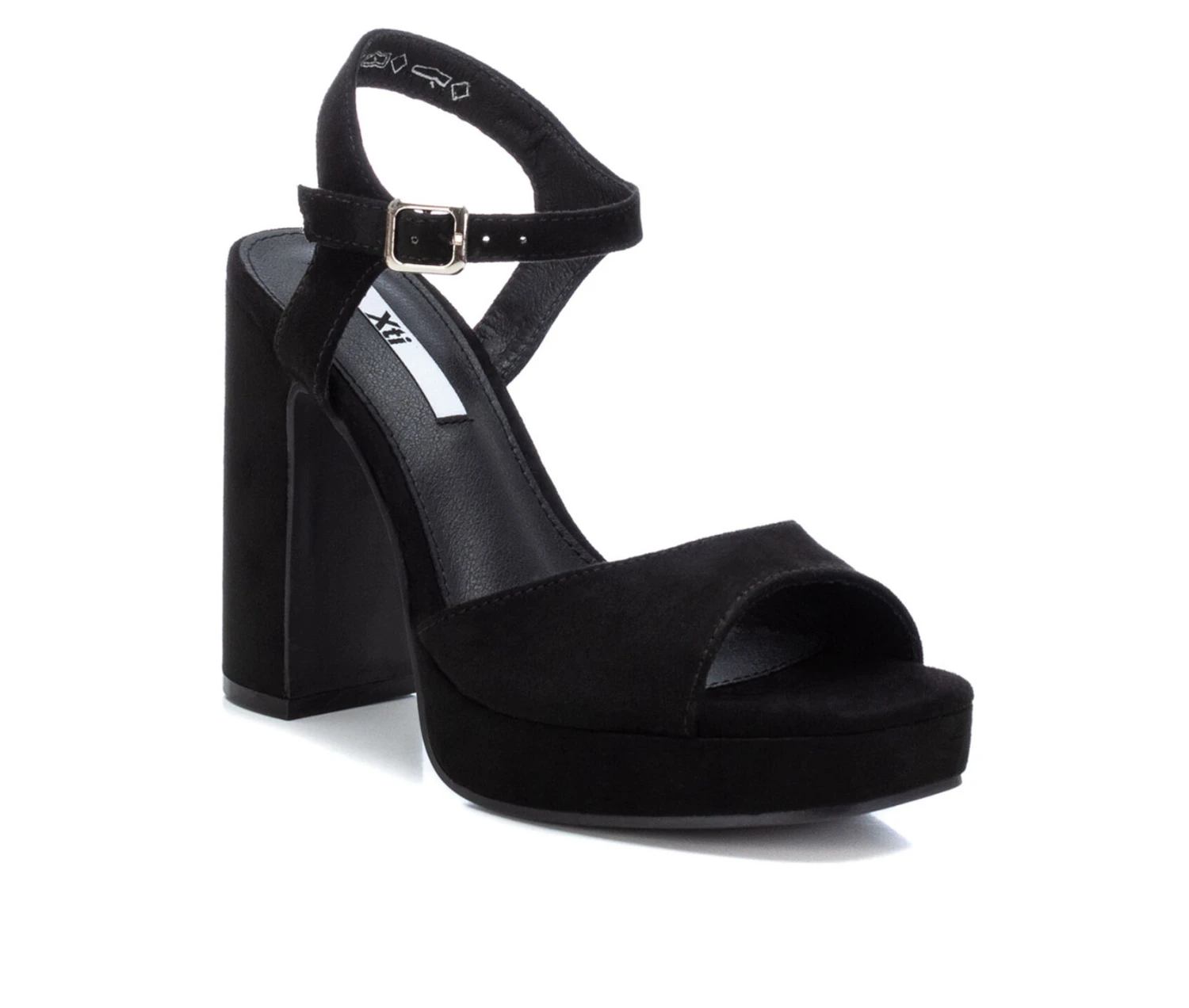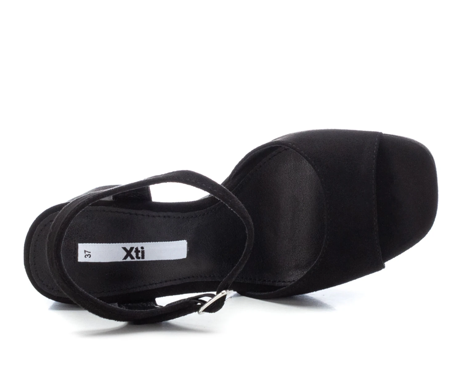 - Women’s Heel Suede Sandals by Xti. Take your style to the next level with Xti Shoes! These 4.33 in high sandals are the perfect blend of casual and comfort. Strap with metallic buckle closure. Non-slip rubber sole. This model has been certified vegan by the worldwide organization PETA.